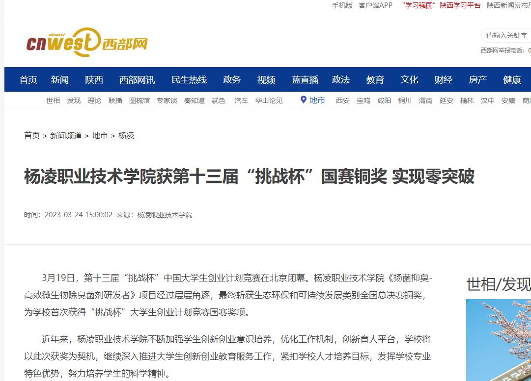【西部网】杨凌职业技术学院获第十三届“挑战杯”国赛铜奖 实现零突破