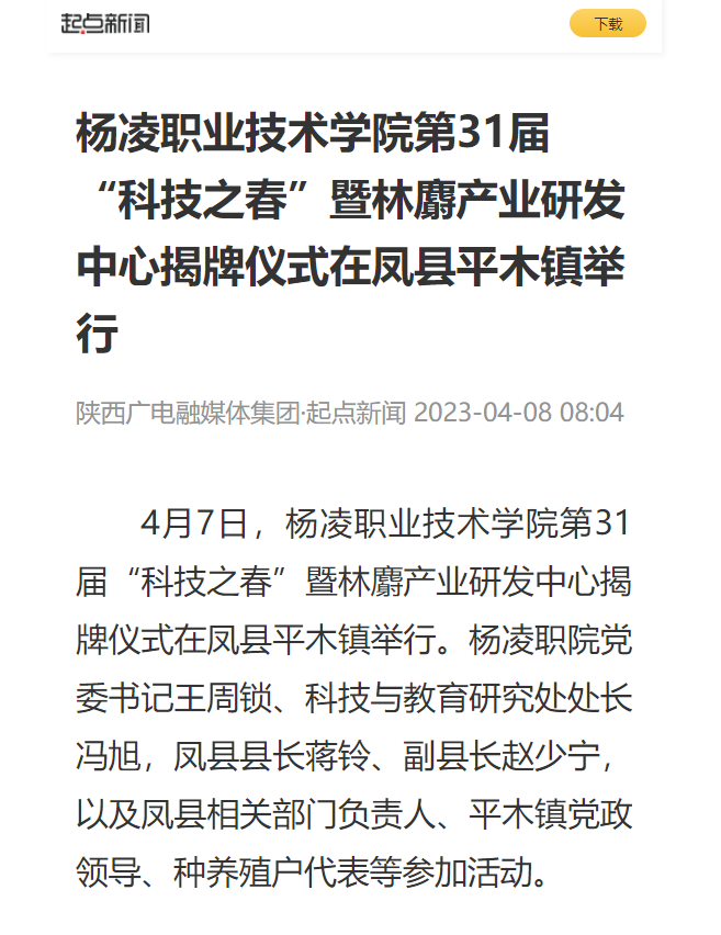 4月7日,杨凌职业技术学院第31届“科技之春”暨林麝产业研发中心揭牌仪式在凤县平木镇举行。杨凌职院党委书记王周锁、科技与教育研究处处长冯旭,凤县县长蒋铃、副县长赵少宁,以及凤县相关部门负责人、平木镇党政领导、种养殖户代表等参加活动。