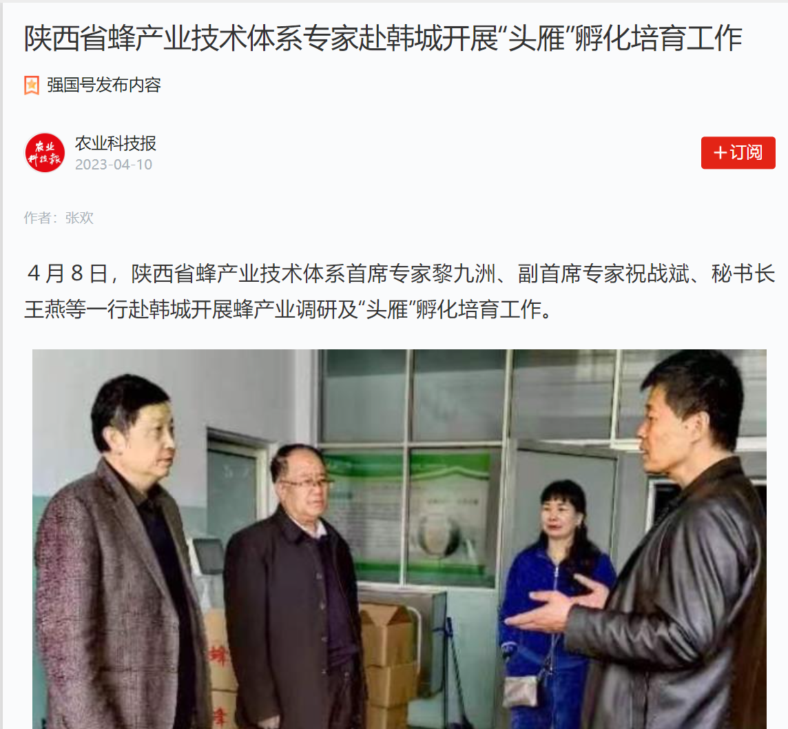 4月8日,陕西省蜂产业技术体系首席专家黎九洲、副首席专家祝战斌、秘书长王燕等一行赴韩城开展蜂产业调研及“头雁”孵化培育工作。