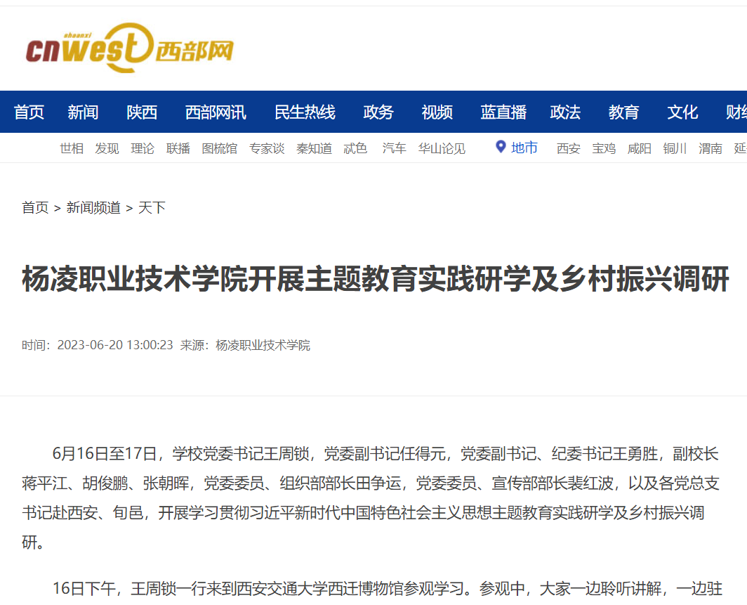 6月16日至17日,学校党委书记王周锁,党委副书记任得元,党委副书记、纪委书记王勇胜,副校长蒋平江、胡俊鹏、张朝晖,党委委员、组织部部长田争运,党委委员、宣传部部长裴红波,以及各党总支书记赴西安、旬邑,开展学习贯彻习近平新时代中国特色社会主义思想主题教育实践研学及乡村振兴调研。