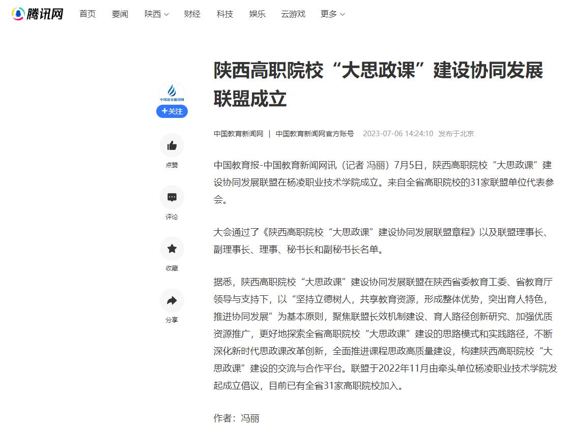 中国教育报-中国教育新闻网讯(记者 冯丽)7月5日,陕西高职院校“大思政课”建设协同发展联盟在杨凌职业技术学院成立。来自全省高职院校的31家联盟单位代表参会。