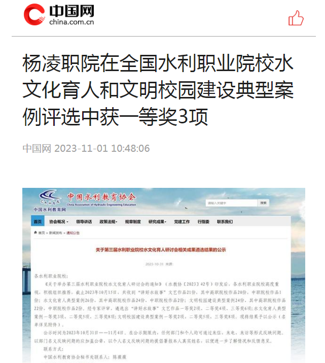 【中国网】杨凌职院在全国水利职业院校水文化育人和文明校园建设典型案例评选中获一等奖3项