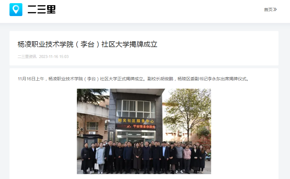 11月16日上午,杨凌职业技术学院(李台)社区大学正式揭牌成立。副校长胡俊鹏,杨陵区委副书记李永东出席揭牌仪式。