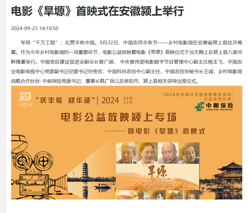 学用“千万工程”,礼赞丰收中国。9月22日,中国农民丰收节——乡村电影周在安徽省颍上县拉开帷幕。作为今年乡村电影周的一项重要环节,电影公益放映暨电影《旱塬》首映仪式于当天晚上在颍上县八里河畔隆重举行。中国老区建设促进会副会长曾广超, 中央宣传部电影数字节目管理中心副主任杨玉飞,中国农业电影电视中心党委副书记纪委书记孙密宏,中国科协农技中心副主任、中国农技协秘书长王诚;乡村电影周战略合作伙伴: 中邮保险党委书记、董事长韩广岳以及阜阳市、颍上县相关领导出席仪式。