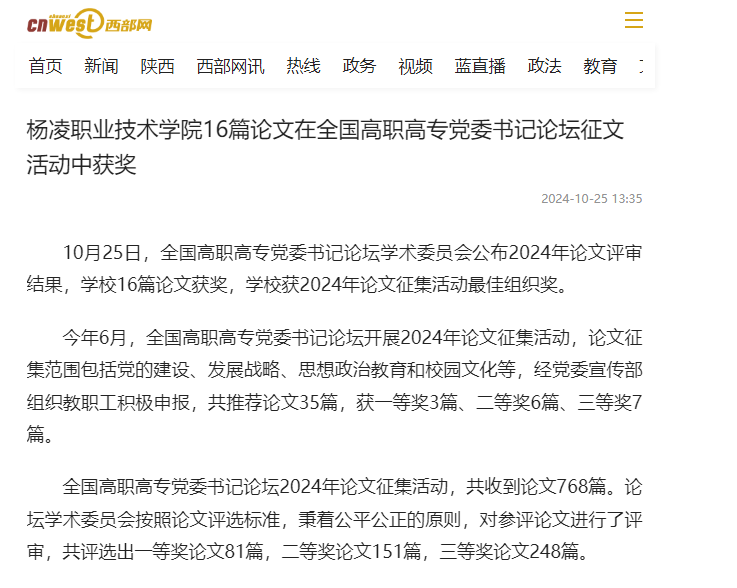 【西部网】杨凌职业技术学院16篇论文在全国高职高专党委书记论坛征文活动中获奖