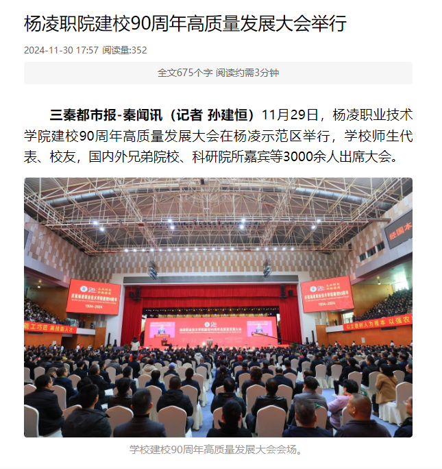 11月29日,杨凌职业技术学院建校90周年高质量发展大会在杨凌示范区举行,学校师生代表、校友,国内外兄弟院校、科研院所嘉宾等3000余人出席大会。