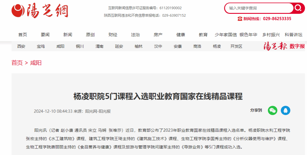 近日,教育部公布了2023年职业教育国家在线精品课程入选名单。杨凌职院水利工程学院张宏主持的《水工建筑物》课程、建筑工程学院王琦主持的《建筑施工技术》课程、生物工程学院李国秀主持的《分析仪器使用与维护》课程、生物工程学院唐丽丽主持的《食品营养与健康》课程及旅游与管理学院问建军主持的《导游业务》等5门课程成功入选。