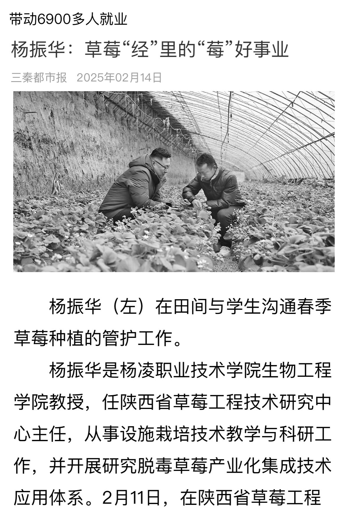 2月12日,在西安市鄠邑区云际种养殖合作莓园里,负责人孙明亮正在忙着草莓二茬的销售工作。春节前后,孙明亮时常通过手机与杨振华沟通草莓的管护工作。两年前,孙明亮在杨教授的指导下采用新模式种植草莓,草莓产量和品质有了显著提升,去年一亩地产量近3000斤,亩均收益4万元。