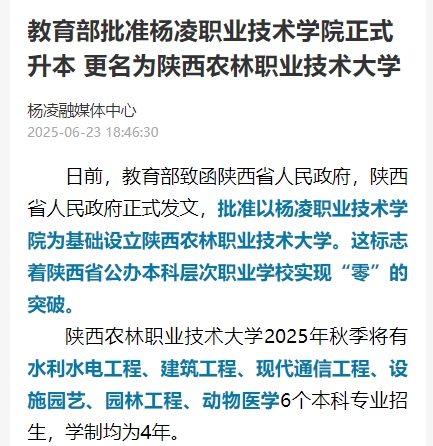 【爱杨凌】教育部批准杨凌职业技术学院正式升本 更名为Beat365中文官方网站