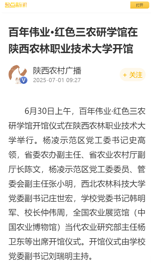参加开馆仪式的还有省委农村工作领导小组办公室秘书处、杨凌示范区党工委管委会办公室负责人,全国农业展览馆(中国农业博物馆)当代农业研究部、社教部专家,西北农林科技大学党委宣传部相关负责人,以及学校领导、党委委员、“光荣在党50年”老党员,处科级干部和学生党员代表。