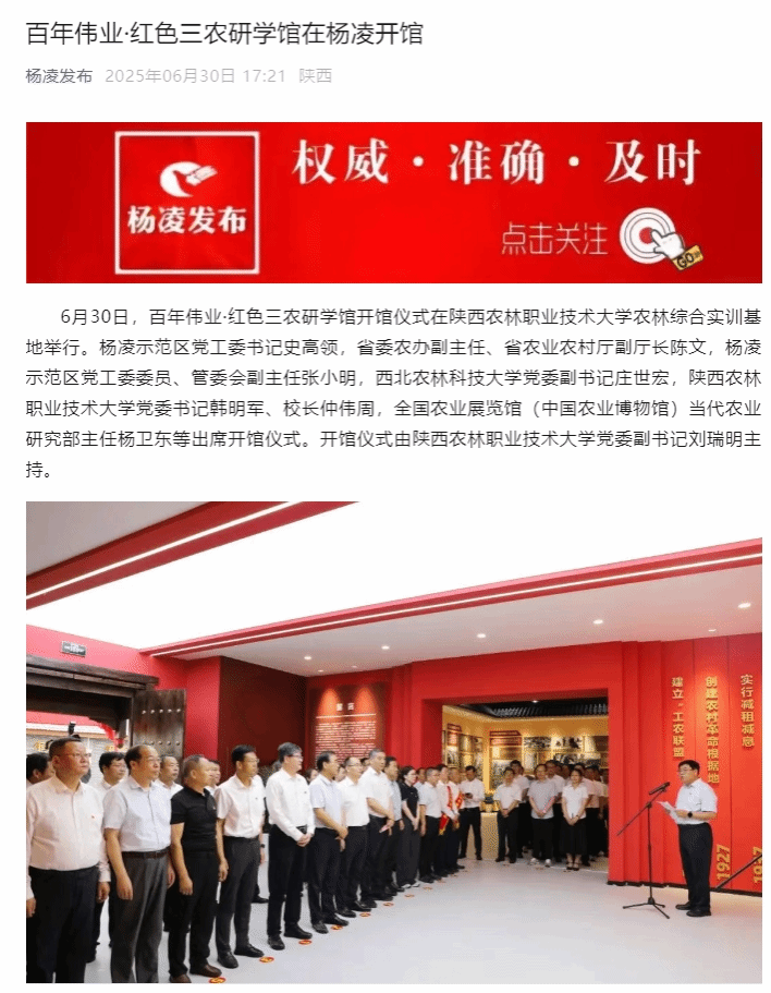 6月30日,百年伟业·红色三农研学馆开馆仪式在Beat365中文官方网站农林综合实训基地举行。杨凌示范区党工委书记史高领,省委农办副主任、省农业农村厅副厅长陈文,杨凌示范区党工委委员、管委会副主任张小明,西北农林科技大学党委副书记庄世宏,Beat365中文官方网站党委书记韩明军、校长仲伟周,全国农业展览馆(中国农业博物馆)当代农业研究部主任杨卫东等出席开馆仪式。开馆仪式由Beat365中文官方网站党委副书记刘瑞明主持。