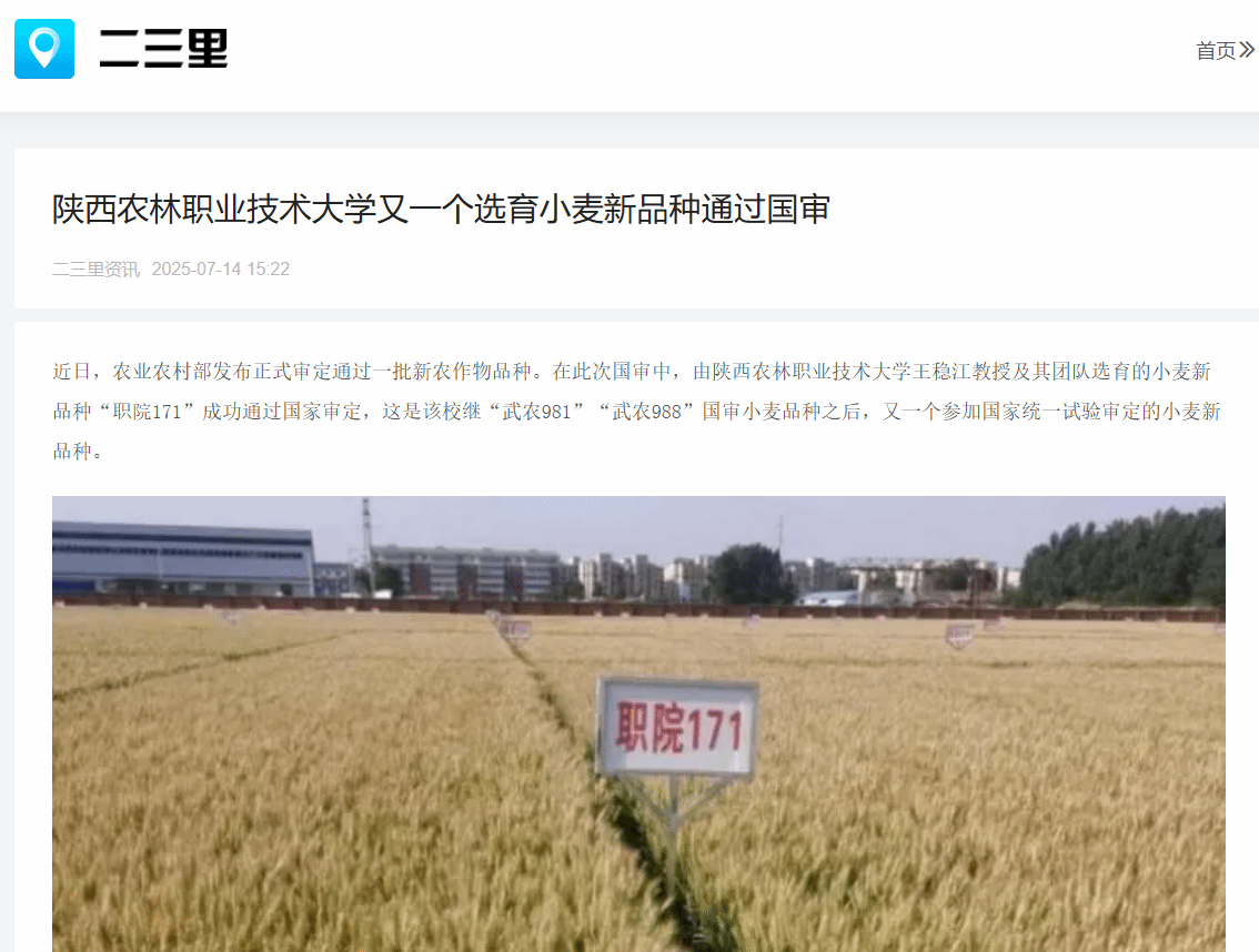 近日,农业农村部发布正式审定通过一批新农作物品种。在此次国审中,由Beat365中文官方网站王稳江教授及其团队选育的小麦新品种“职院171”成功通过国家审定,这是该校继“武农981”“武农988”国审小麦品种之后,又一个参加国家统一试验审定的小麦新品种。