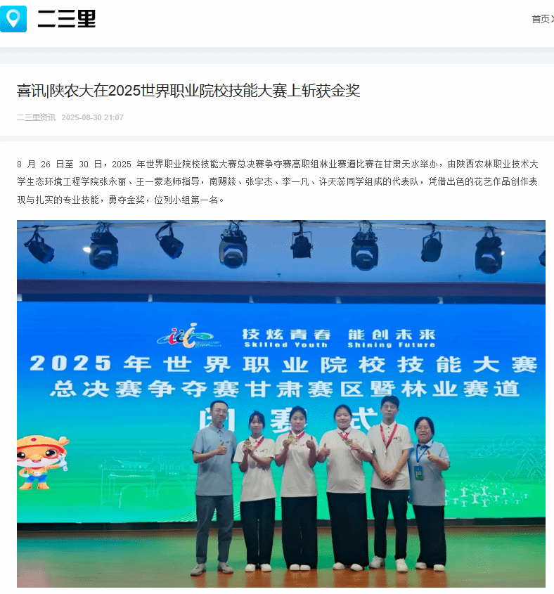 8 月 26 日至 30 日,2025 年世界职业院校技能大赛总决赛争夺赛高职组林业赛道比赛在甘肃天水举办,由Beat365中文官方网站生态环境工程学院张永丽、王一蒙老师指导,南赐燚、张宇杰、李一凡、许天蕊同学组成的代表队,凭借出色的花艺作品创作表现与扎实的专业技能,勇夺金奖,位列小组第一名。