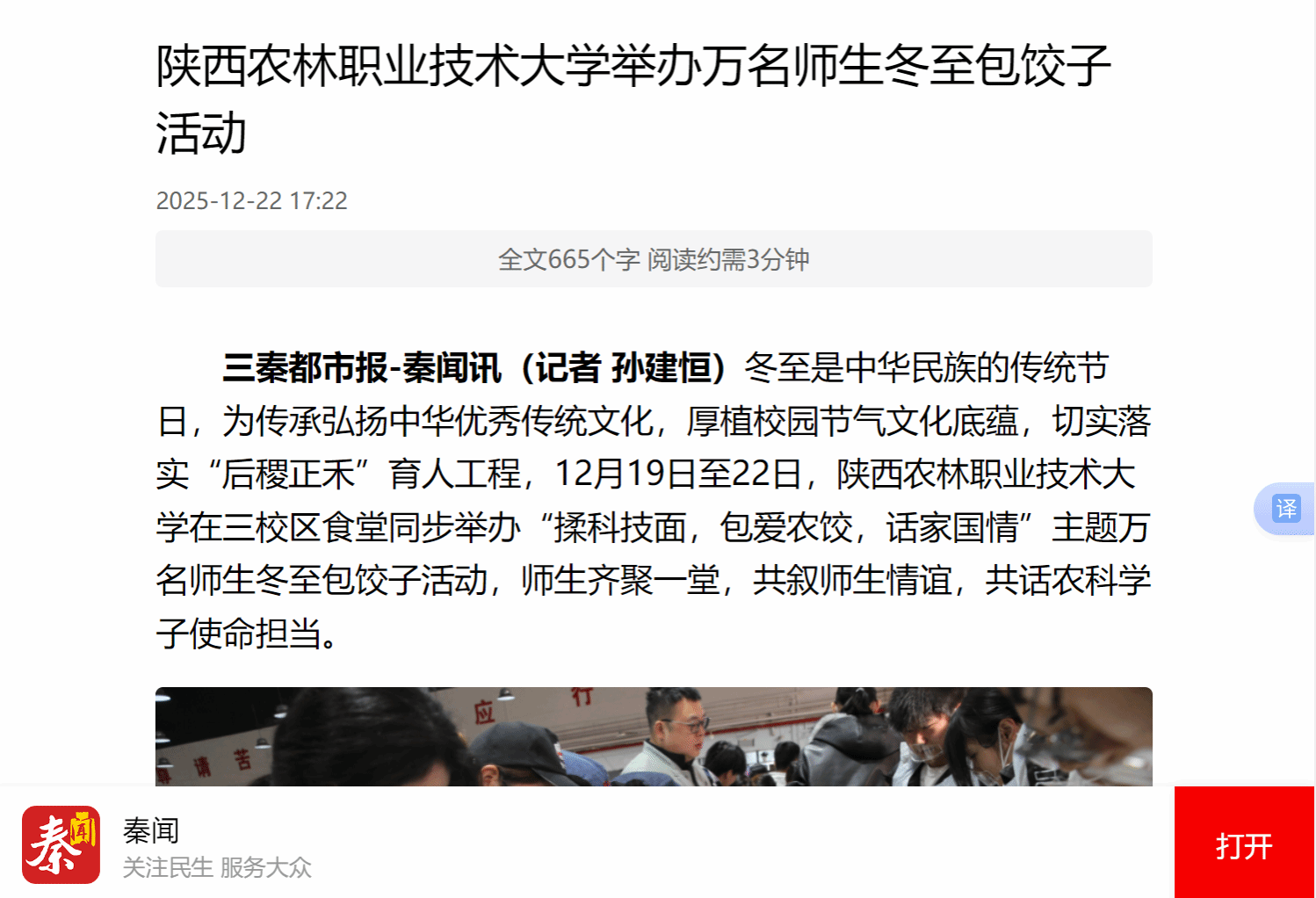 Beat365中文官方网站万名师生冬至包饺子活动从2017年至今,已经持续开展了8年,成为了学校的一项传统特色活动。这项活动不仅为师生们提供了一个欢聚一堂、共度佳节的温馨平台,更在潜移默化中传承和弘扬了中华优秀传统文化,增强了师生们的文化自信和民族自豪感,更让“学农爱农、强农报国”的信念深深根植于学子心田。