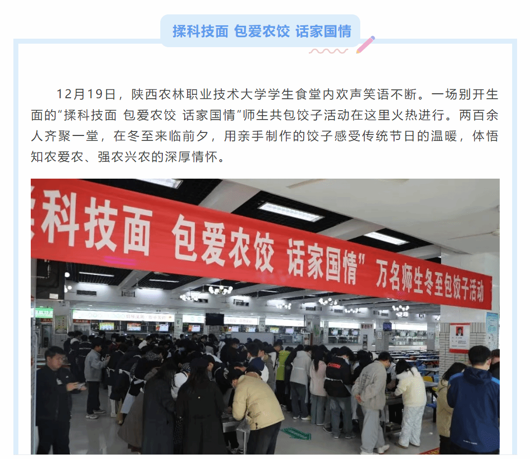 据悉,为让全校师生都能共享冬至温暖,学校特意在冬至当天为每位在校学生发放一张饺子券,共计发放1.5万张。届时,全校学生均可凭券在食堂免费领取一份热气腾腾的饺子,品尝到这份冬日暖意。