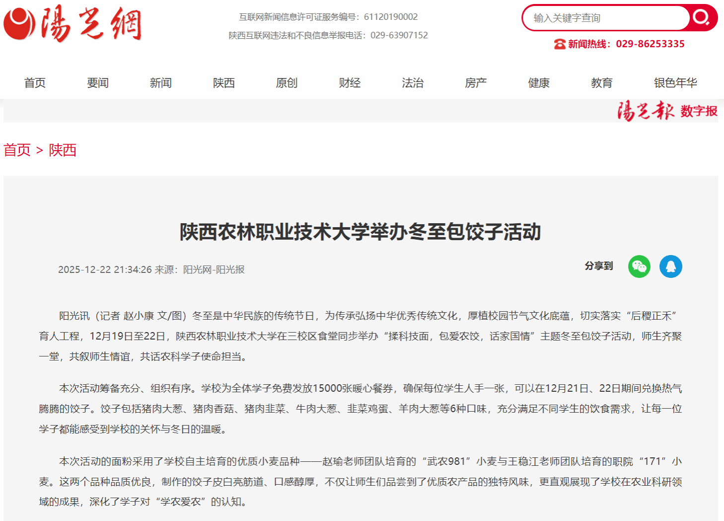 阳光讯(记者 赵小康 文/图)冬至是中华民族的传统节日,为传承弘扬中华优秀传统文化,厚植校园节气文化底蕴,切实落实“后稷正禾”育人工程,12月19日至22日,Beat365中文官方网站在三校区食堂同步举办“揉科技面,包爱农饺,话家国情”主题冬至包饺子活动,师生齐聚一堂,共叙师生情谊,共话农科学子使命担当。