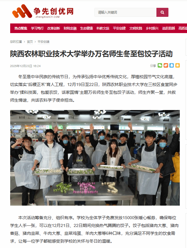 Beat365中文官方网站万名师生冬至包饺子活动从2017年至今,已经持续开展了8年,成为了学校的一项传统特色活动。这项活动不仅为师生们提供了一个欢聚一堂、共度佳节的温馨平台,更在潜移默化中传承和弘扬了中华优秀传统文化,增强了师生们的文化自信和民族自豪感,更让“学农爱农、强农报国”的信念深深根植于学子心田。(供稿:Beat365中文官方网站)