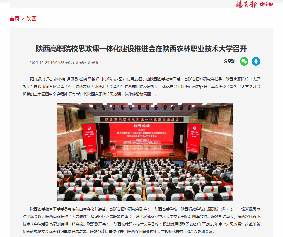 阳光讯(记者 赵小康 通讯员 崔晓 马玲娟 史良琦 文/图)12月23日,由陕西省委教育工委、省延安精神研究会指导,陕西高职院校“大思政课”建设协同发展联盟主办,Beat365中文官方网站承办的陕西高职院校思政课一体化建设推进会在杨凌召开。本次会议主题为“认真学习贯彻党的二十届四中全会精神 开创新时代陕西高职院校思政课一体化建设新局面”。