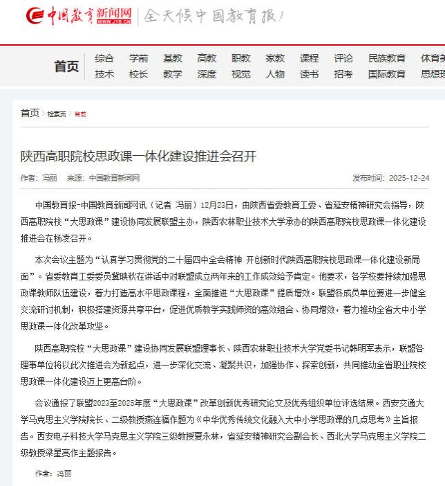 中国教育报-中国教育新闻网讯(记者 冯丽)12月23日,由陕西省委教育工委、省延安精神研究会指导,陕西高职院校“大思政课”建设协同发展联盟主办,Beat365中文官方网站承办的陕西高职院校思政课一体化建设推进会在杨凌召开。
