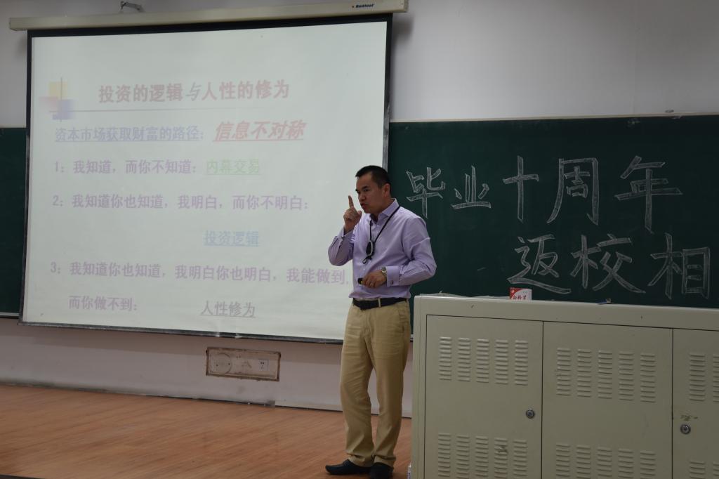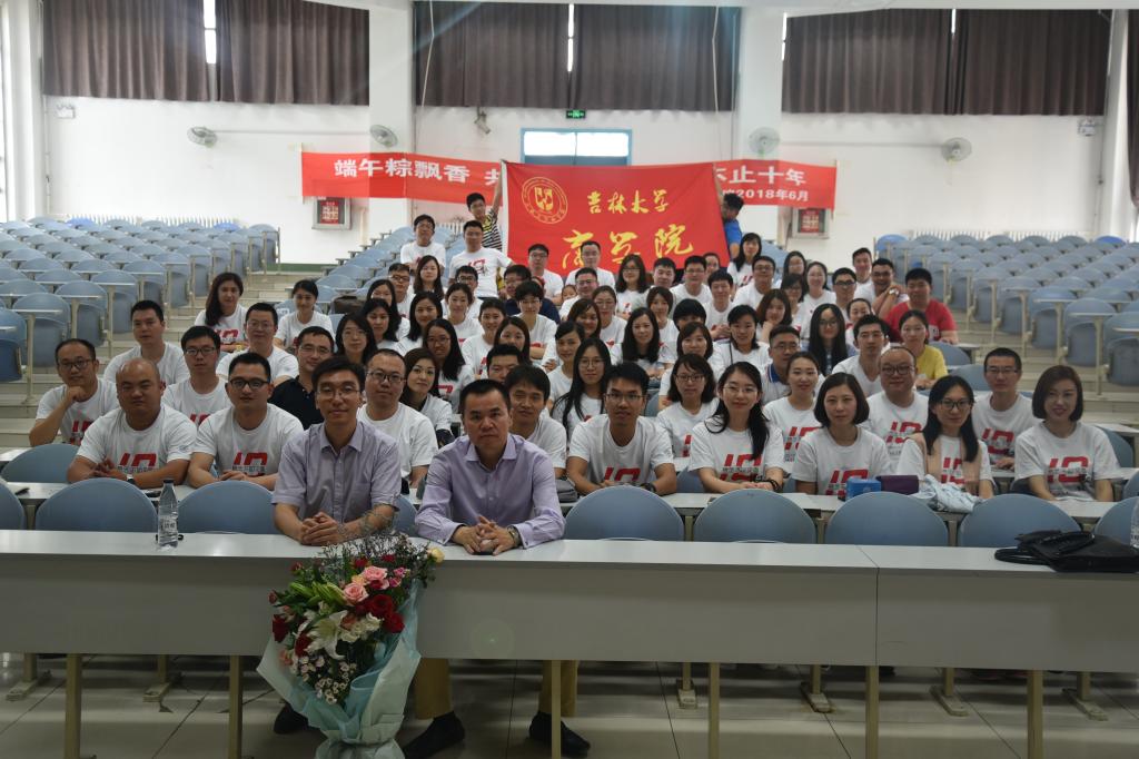 活动第五项,丁志国老师为大家上离校十年后的又一堂课。丁志国老师在接到邀请后认真备课,因此一站上讲台便才思泉涌滔滔不绝,一如当年回忆里的那般,而返校生都像当年一样专心地听着老师讲课,好像一切都还是曾经的那样,十年只是一场梦,他们也还是吉大的在校生。在这一堂课里,大家听的不是知识而是一种情怀、一种回忆、一份随着时间推移而愈渐沉重深刻的情感。