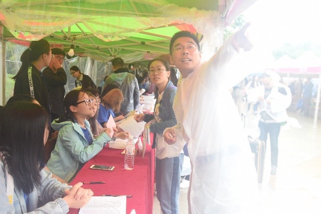 迎新工作如火如荼,五月花广场上到处都是忙碌的身影。前台工作者统一穿着蓝色志愿服引导新生们完成报到的所有流程:签到、领一卡通、收费以及照相等等。整个过程紧张高效地进行着,井然有序,有条不紊,荣诗达老师,刘天目老师以及陈卓老师热情给新生、家长回答着他们提出的各种问题,指导迎新工作。
