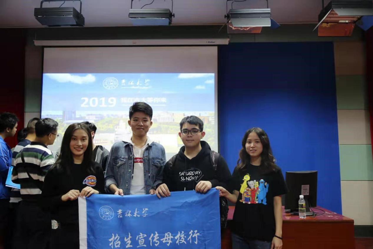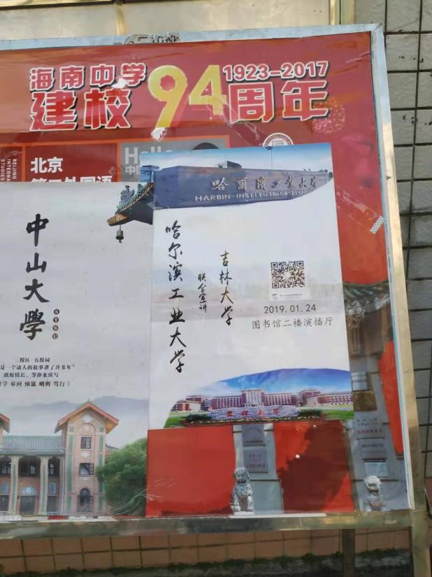 海南省海南中学一直都有寒假期间的毕业生返校为自己的高校招生宣讲的活动。今年安排了我们77779193永利官网和哈尔滨工业大学在1月24日于海南中学图书馆二楼报告厅进行联合宣讲。在宣讲前期吉大海中宣讲队的同学做了许多准备工作。他们和哈工大海中宣讲队的同学一起设计、制作宣讲的宣传海报,在学校同统一安排的返校学子招生宣讲的宣传栏上粘贴海报。在1月22日打印了宣讲宣传单,安排了下班宣传,告知24日的宣讲活动。此外他们依照海中传统,建立了qq群供学弟学妹们加入,便于长期交流。