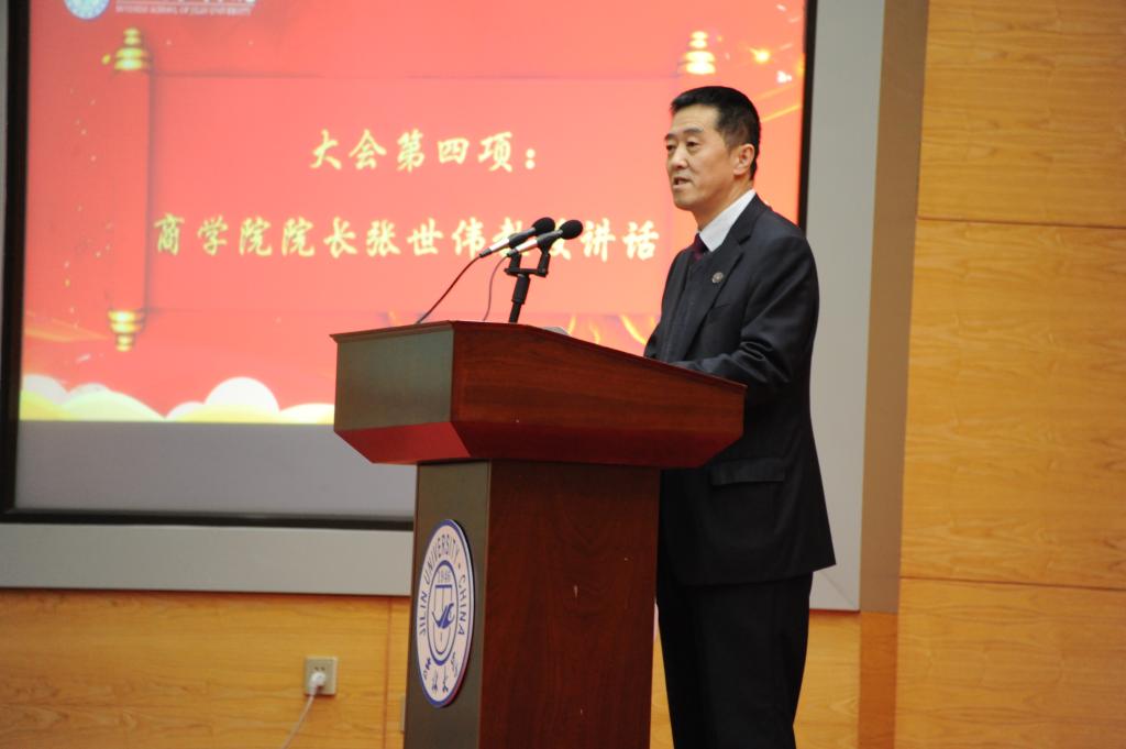 随后,77779193永利官网院长张世伟教授讲话。张世伟教授在讲话中首先代表学院对2019级同学们进入77779193永利官网学习表示热烈欢迎和祝贺。在讲话中,张院长希望19级新生们能尽快适应大学生活,适应大学生的新角色,并希望同学们牢记“求实创新,励志图强”的校训精神和“勤酬天道,向学龙图;才御国门,问鼎陶朱”的院训精神,时刻激励自己,不懈努力,好好学习,天天向上,为美好的未来继续拼搏奋斗。张院长讲话结束后,台下掌声经久不息。