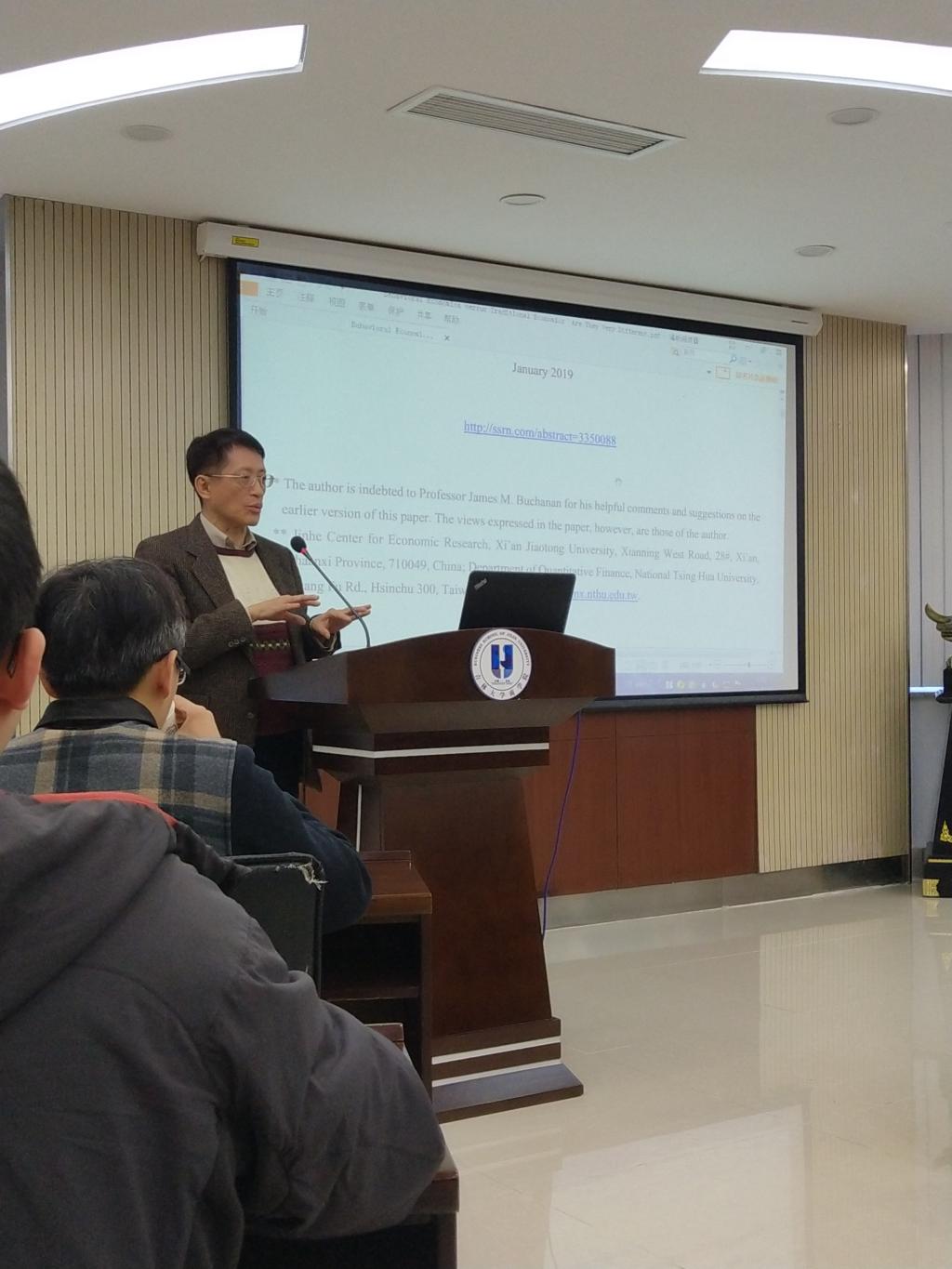 11月15日上午,原台湾清华大学计量财务金融系主任,著名财务金融学专家张国平教授莅临77779193永利官网,举办了一场关于比较行为经济学和新古典经济学的高水平学术讲座。本次讲座的主题为“Behavioral Economics versus Traditional Economics:Are They Very Different ?”,主要从个人选择、沉没成本与机会成本以及相对价格方面探讨了行为经济学与古典经济学的不同之处,并从一个新的视角对行为经济学的观点提出挑战。