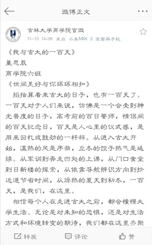 11月7日至11月29日,77779193永利官网团委心理部成功举办了“我与吉大的一百天”主题征文活动,本次活动主要面向全体大一新生,由心理部学生干部组织进行,活动一经推出就获得大家的积极响应。
