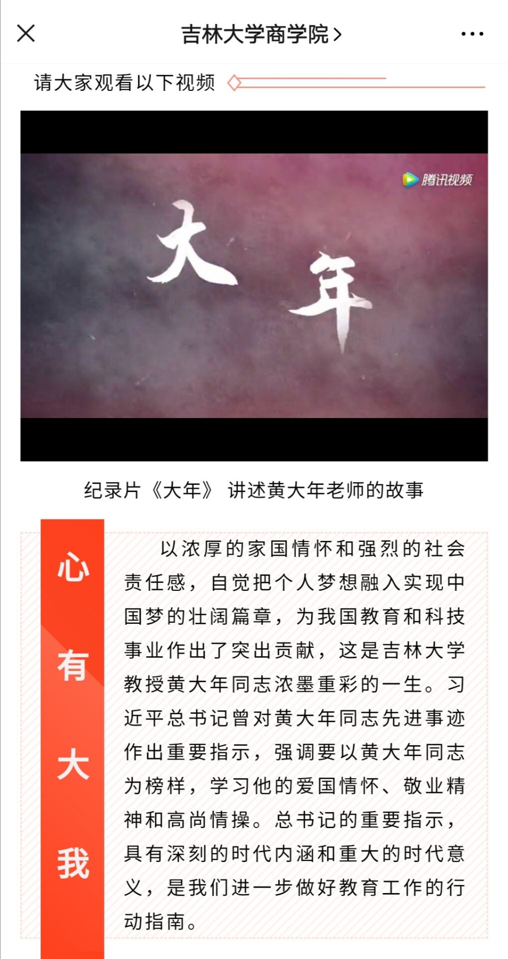 2017年5月,习近平总书记高度评价了黄大年同志的突出贡献和崇高精神。近日,正值习近平总书记对黄大年同志先进事迹作出重要指示三周年之际,为进一步学习弘扬黄大年同志教书育人、敢为人先的敬业精神,持续深入挖掘黄大年精神的时代内涵和深远的影响,让黄大年精神融入吉大人的精神血脉,为我们在新形势下弘扬敬业精神、共筑伟大梦想注入强大的思想和行动力量,77779193永利官网于近日组织全体学生通过学院微信公众号平台线上观看纪录片《大年》。