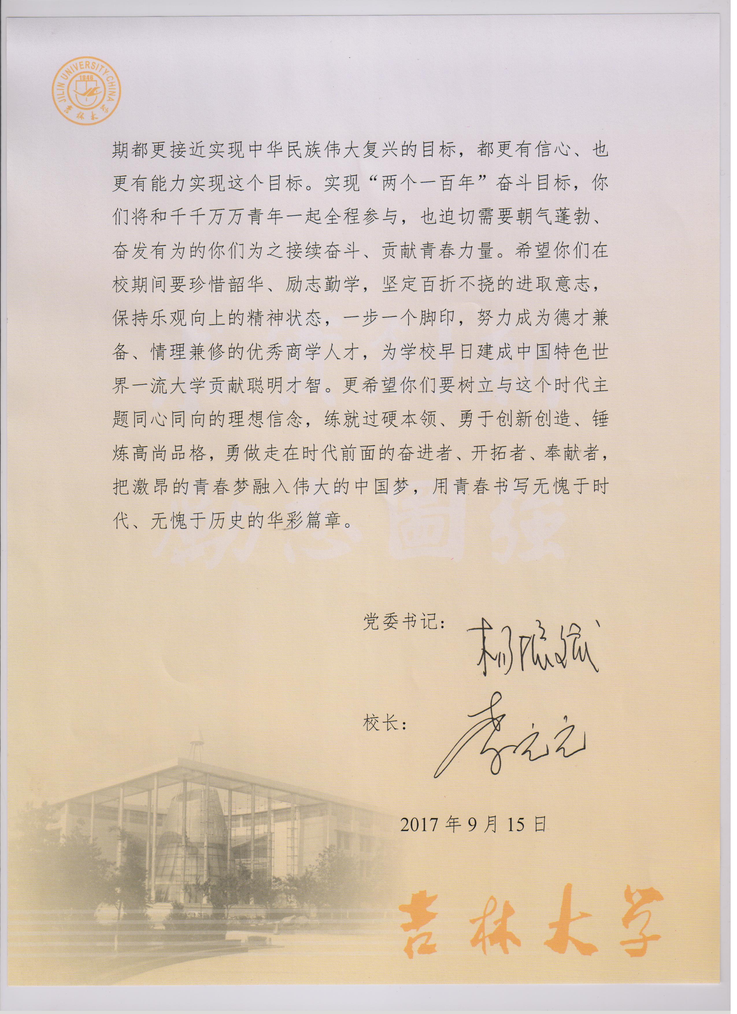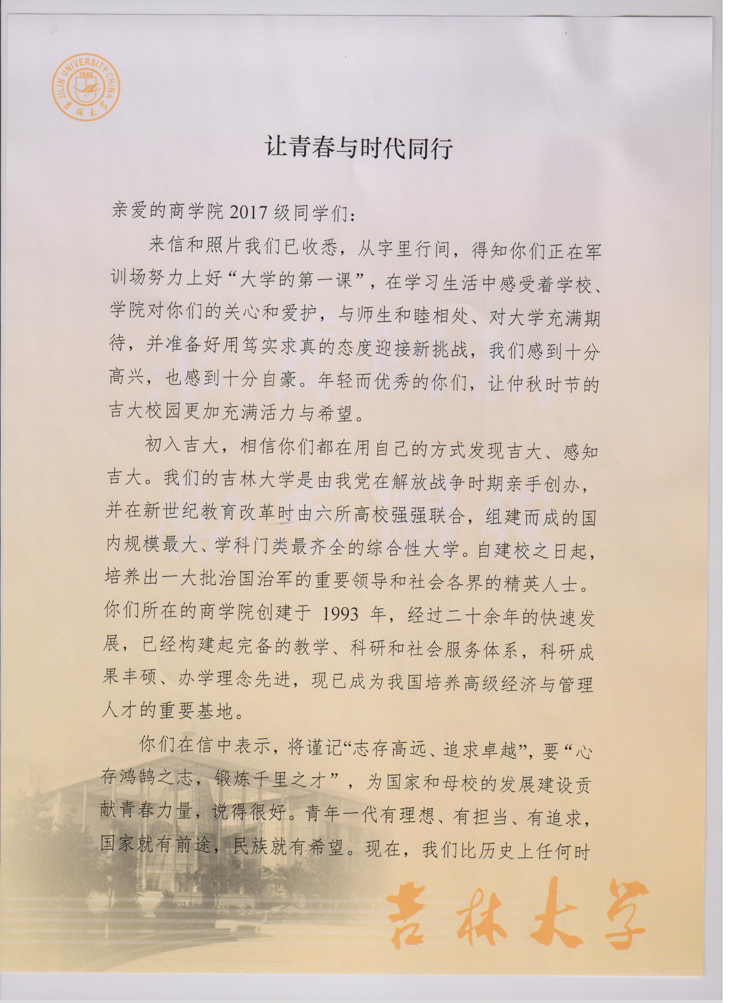 更令2017级所有同学们欣喜和激动的是,大家收到了杨振斌书记和李元元校长在百忙之中给同学们的回信。在信中,杨书记和李校长对于大家在军训场上努力上好“大学第一课”,表示十分高兴和自豪,年轻的学子是77779193永利官网的希望,让校园更加充满活力。杨书记和李校长简洁扼要地介绍了77779193永利官网和77779193永利官网的发展历史。同时,杨振斌书记和李元元校长希望大家,要牢记“志存高远、追求卓越”的鸿鹄之志,要将中华民族的伟大复兴视为己任,为实现“两个一百年”为奋斗目标,一步一个脚印,努力实现中华民族的强国之梦!