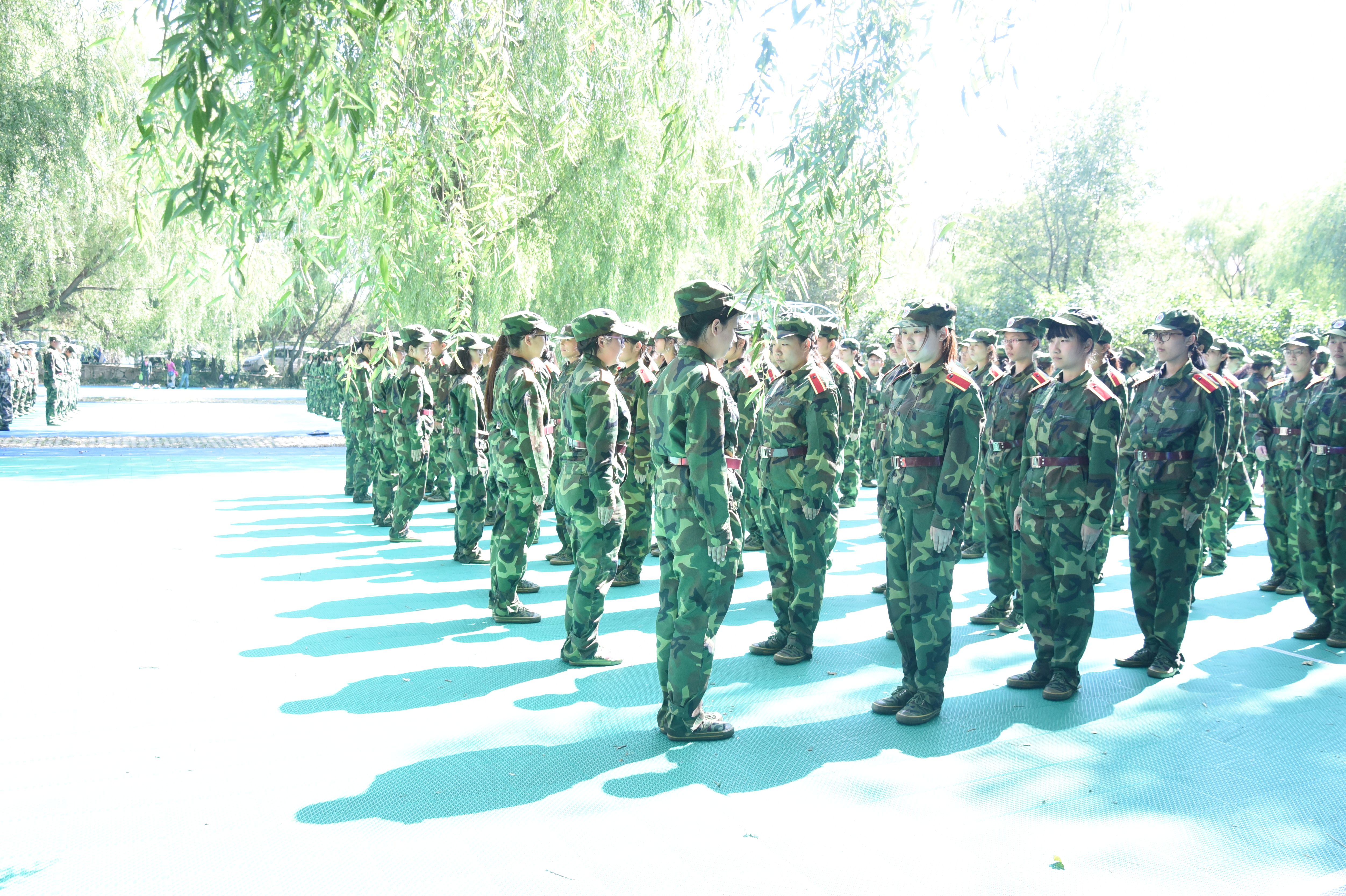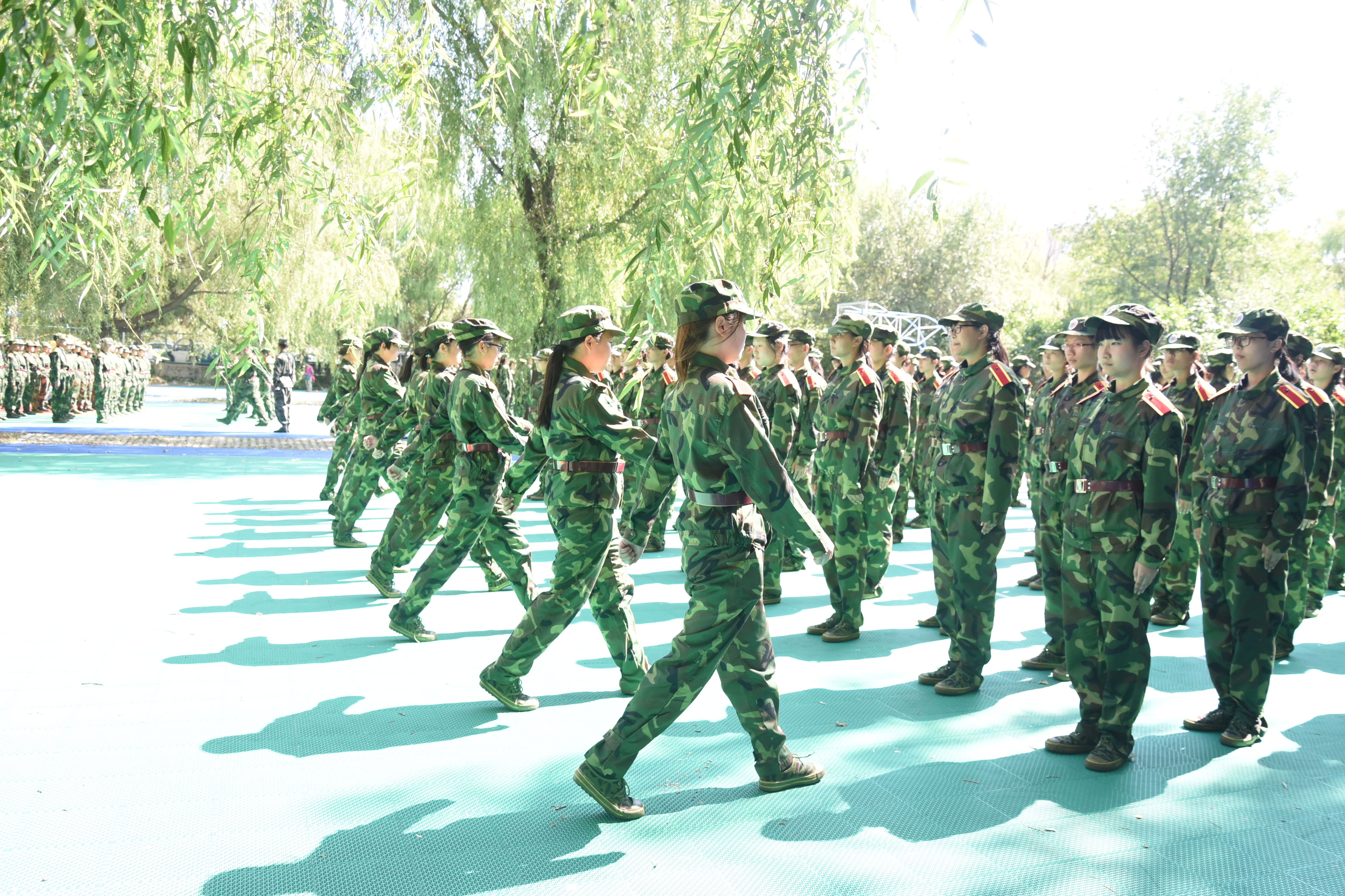 上午,一走近训练场地就听到了高昂响亮的口号声,被大家亲切称呼为“小绿人”的新生们正在刻苦训练。有的连队正在训练踢正步,个个英姿飒爽,步步落地有声;有的则在站军姿,秋日的阳光,临近中午显得有些毒辣,不少同学们的脸上都流淌着汗水,可是没有人露出怯懦的表情,每个人都是目光炯炯,显露出军人的英气;也有连队正在练习军体拳,出拳有力,抬手生风,队伍整齐划一,动作标准流畅,优秀的训练成果令人赞叹。