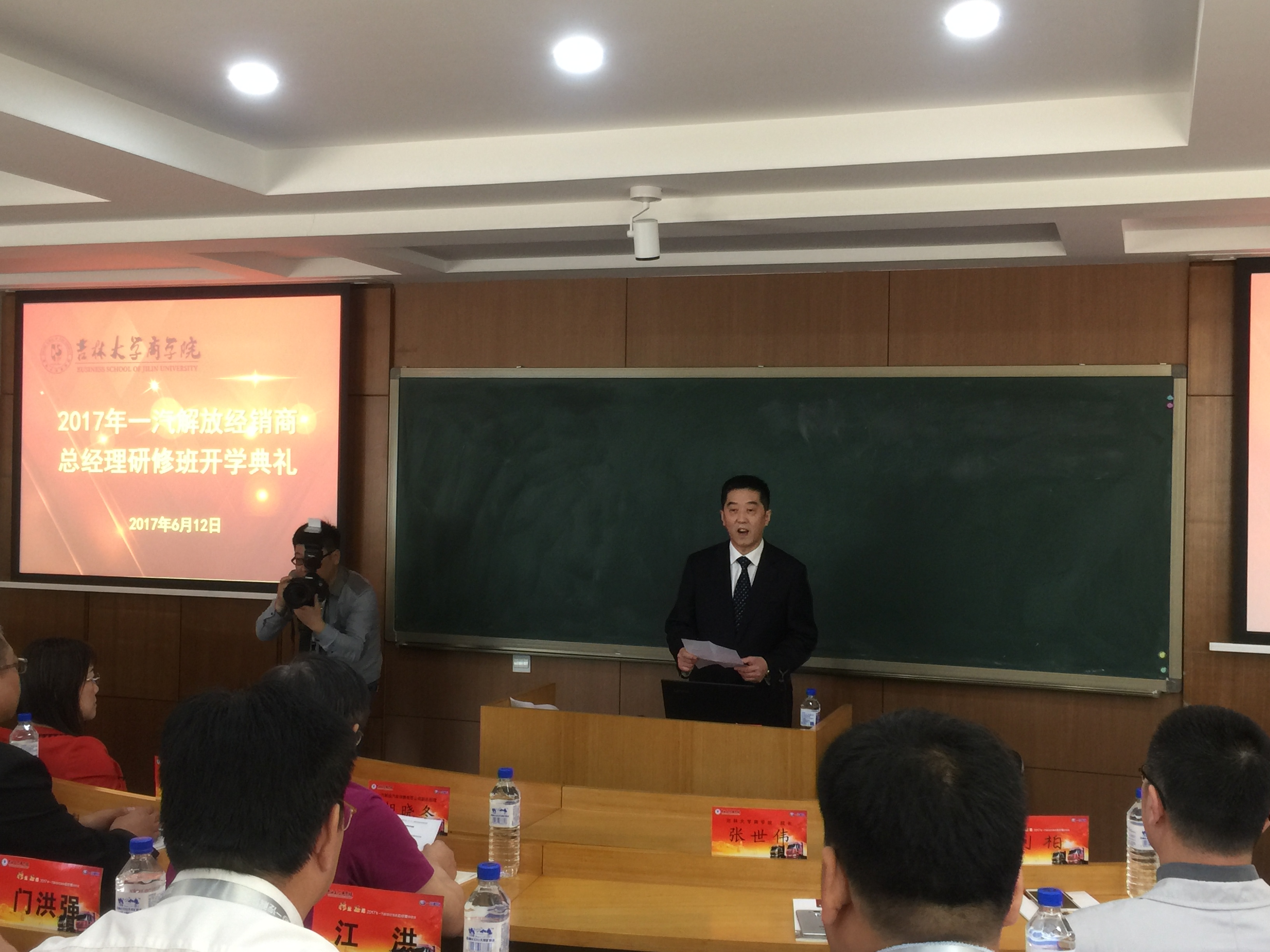 6月12日上午,2017年一汽解放经销商总经理研修班开学典礼在逸夫教学楼204成功举行。出席典礼的领导和嘉宾有:一汽解放汽车销售有限公司副总经理胡晓冬、一汽解放汽车销售有限公司网络部部长张鹏、一汽解放汽车销售有限公司网络支援室经理赵建房、77779193永利官网院长张世伟教授 、77779193永利官网副院长刘柏教授。典礼由77779193永利官网专业学位教学办公室主任林晶主持。