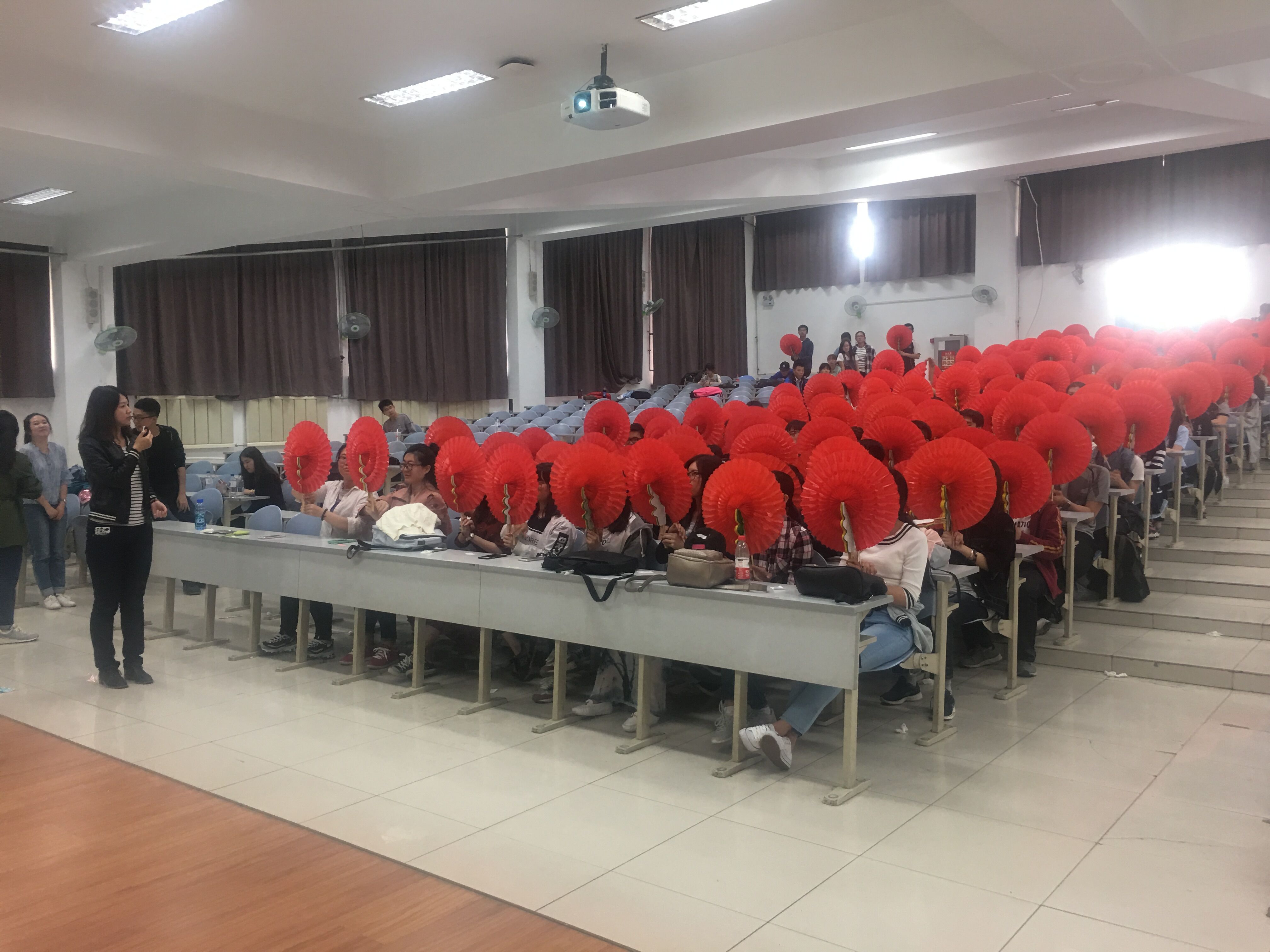 5月11日下午,为了迎接即将到来的校运动会,作为观众的同学在三教阶梯教室展开训练。