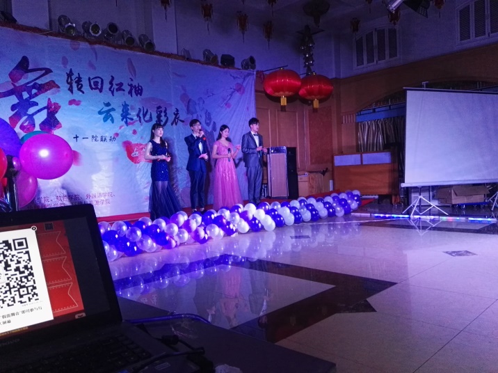 3月26日18:00,我们在友谊会馆举办了假面舞会。舞会开始前滚动播放女生节系列活动视频,对本次活动进行回顾。随后是乐队表演,极大地活跃了现场的气氛。接着由各个学院进行节目表演,晚会期间还有抽奖、游戏等环节,观众纷纷热情高涨。最后,在主持人的引领下,邀请了几位同学上台与大家一起现场学跳华尔兹。