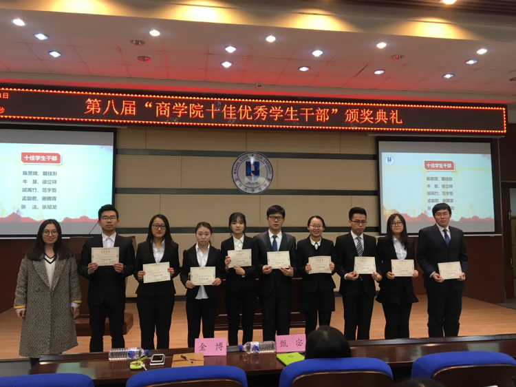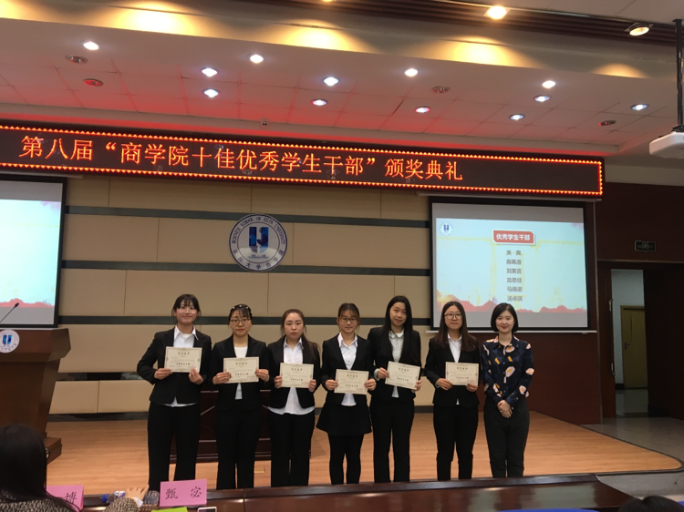 经过几位评委的认真审核,最终确定了获奖名单,并于4月1日中午12:00在东荣大厦B310举行了颁奖典礼。金老师和甄老师分别为十佳学生干部,优秀学生干部颁奖。