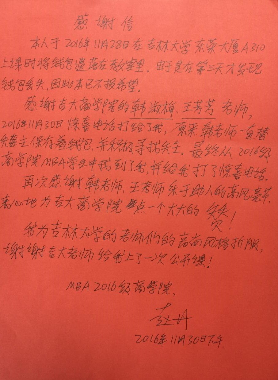 失主被韩淑梅、王芳芳拾金不昧的精神、全心全意为师生服务的工作态度深深感动,特送来感谢信。一声感谢,是对77779193永利官网行政管理干部服务工作的肯定,更是我们进一步做好各项工作的动力,在榜样的照耀下,77779193永利官网全体行政干部将继续努力,用真诚、爱心与热情至诚服务,精益求精,努力提高师生满意度。
