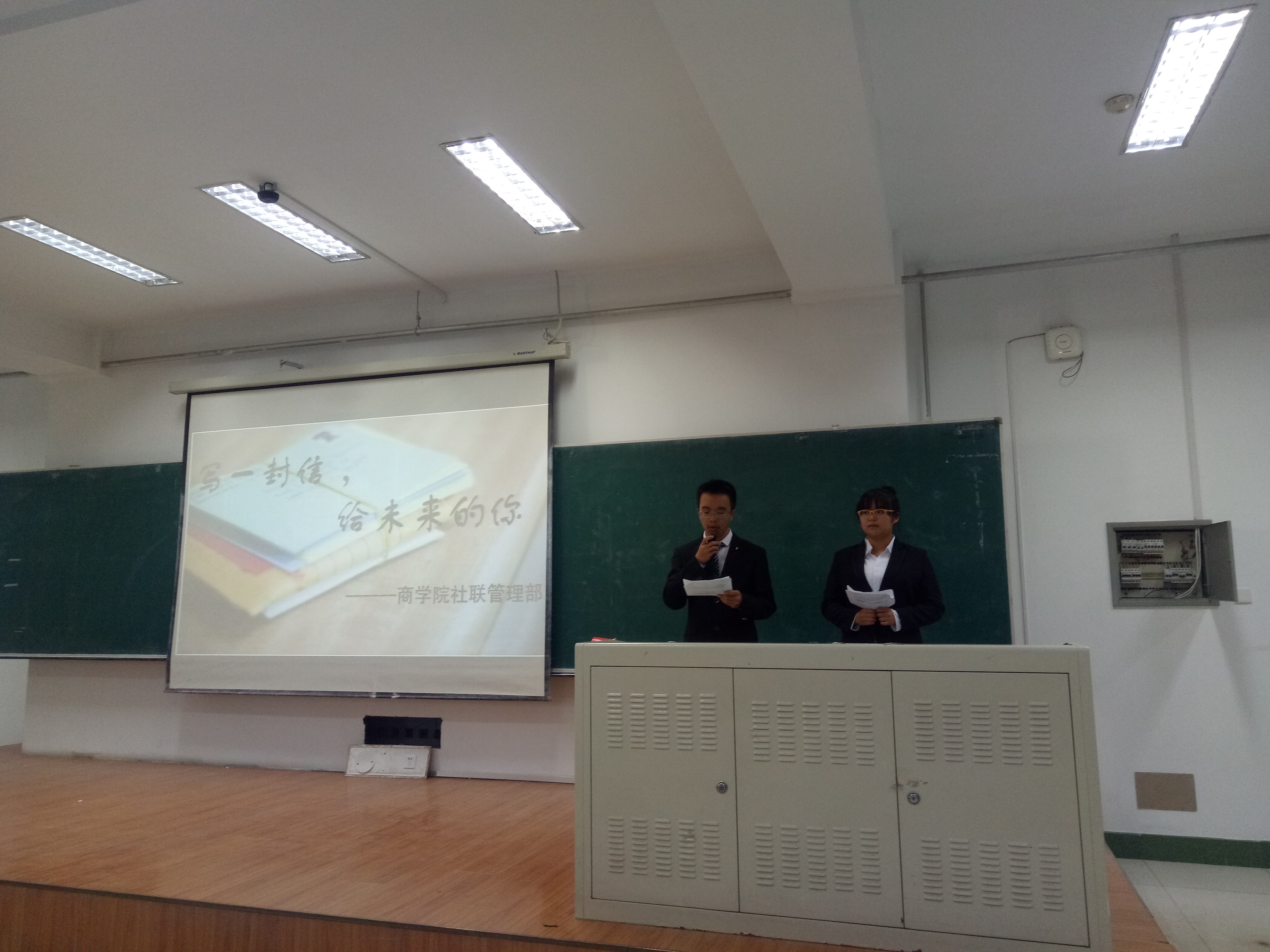 本次活动共分为三个部分,首先是主持人阐述本次活动意义及目的。接下来是荣老师致辞,荣老师肯定了本次活动的意义和价值,表达了对77779193永利官网大一新生的期许,希望大家能够脚踏实地、不忘初心的度过大学的美好四年。最后是派发信封的环节。各班班长上台领取了信封,之后将会统一发给同学们。这些信在同学们写好后由管理部统一保管,并在一年以后归还到同学们手中。