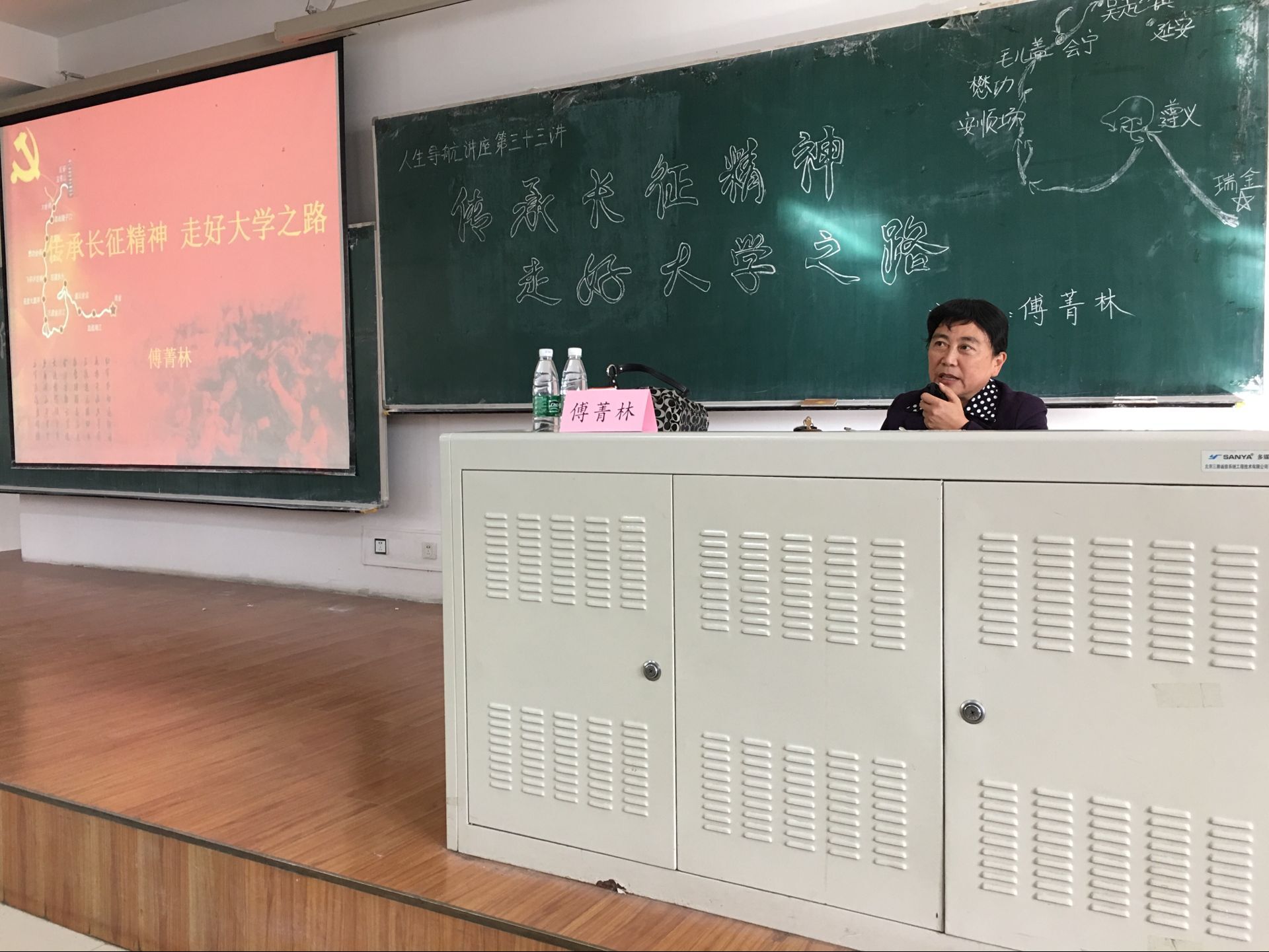 本次讲座旨在纪念长征胜利八十周年,传承长征精神,继承革命传统,培养当代合格的大学生。傅教授从长征及长征精神讲起,由《雪山小太阳》等长征时的真实故事展开,让同学们深入地理解不怕牺牲,前赴后继,勇往直前,百折不挠,克服困难这种伟大的长征精神。之后傅教授联系实际和自己的大学经历,强调了在生活中传承长征精神的必要性,我们当代大学生首先应该讲道德,有品行,其次要有团队合作意识,要敢于拼搏,艰苦奋斗,只要同学们有一个坚定的信念,相信如同长征一样就能实现人生长征的胜利和丰收。