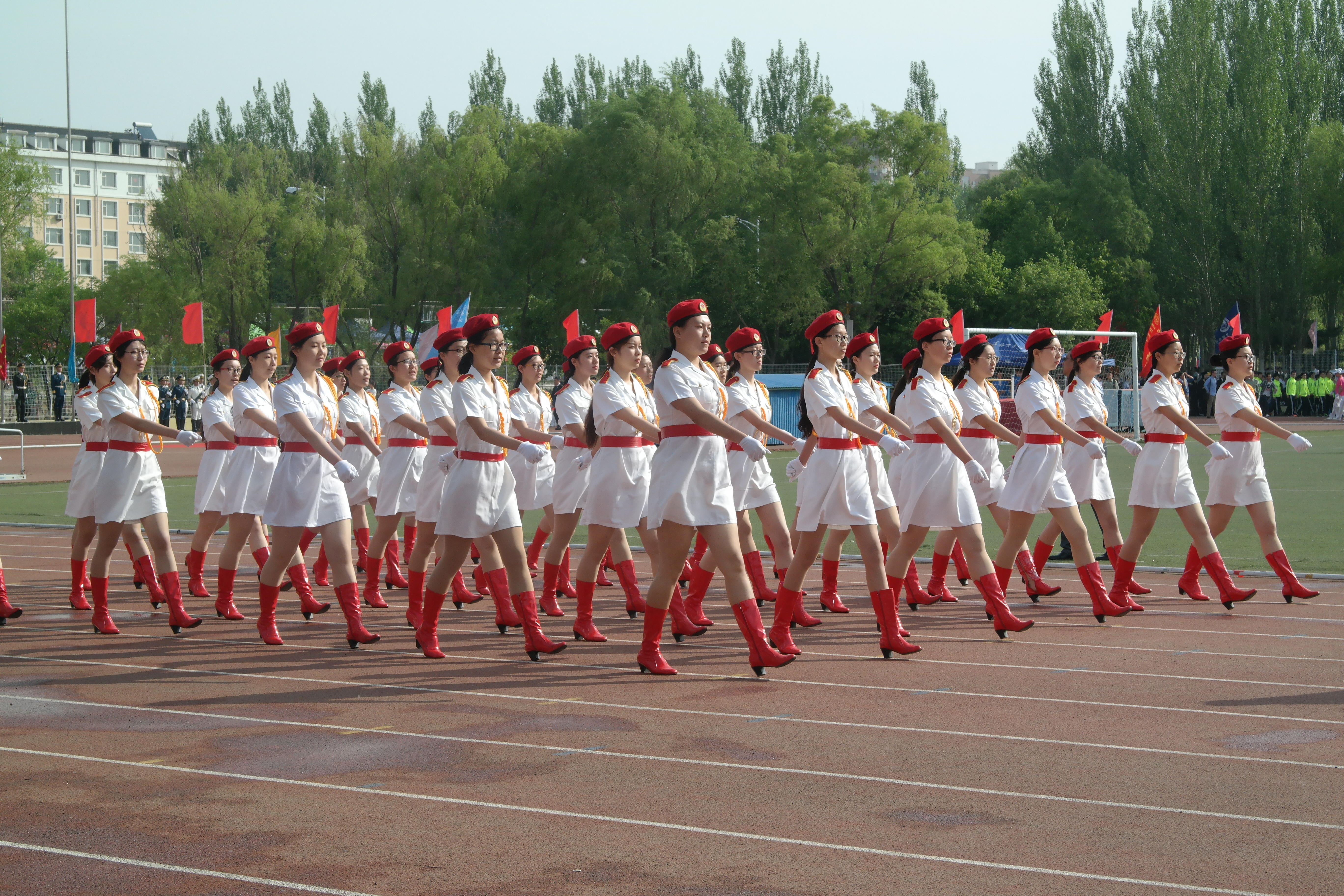 首先进行的是方队入场。各学院身穿代表自己学院特色的制服,迈着整齐的步伐向领导和观众们致敬。蓝天白云下,商院女生身穿白色军装,腰间佩戴红色腰带,胸前金黄麦穗与头上的红帽、脚下红皮鞋相映,队伍整体精神饱满,气宇轩昂,充满自信与活力。在方阵队经过主席台时,我们踢出整齐的正步、呐喊出“商院雄风,气势如虹;才行天下,立定苍穹”的方阵口号,群情激越,场面热烈。