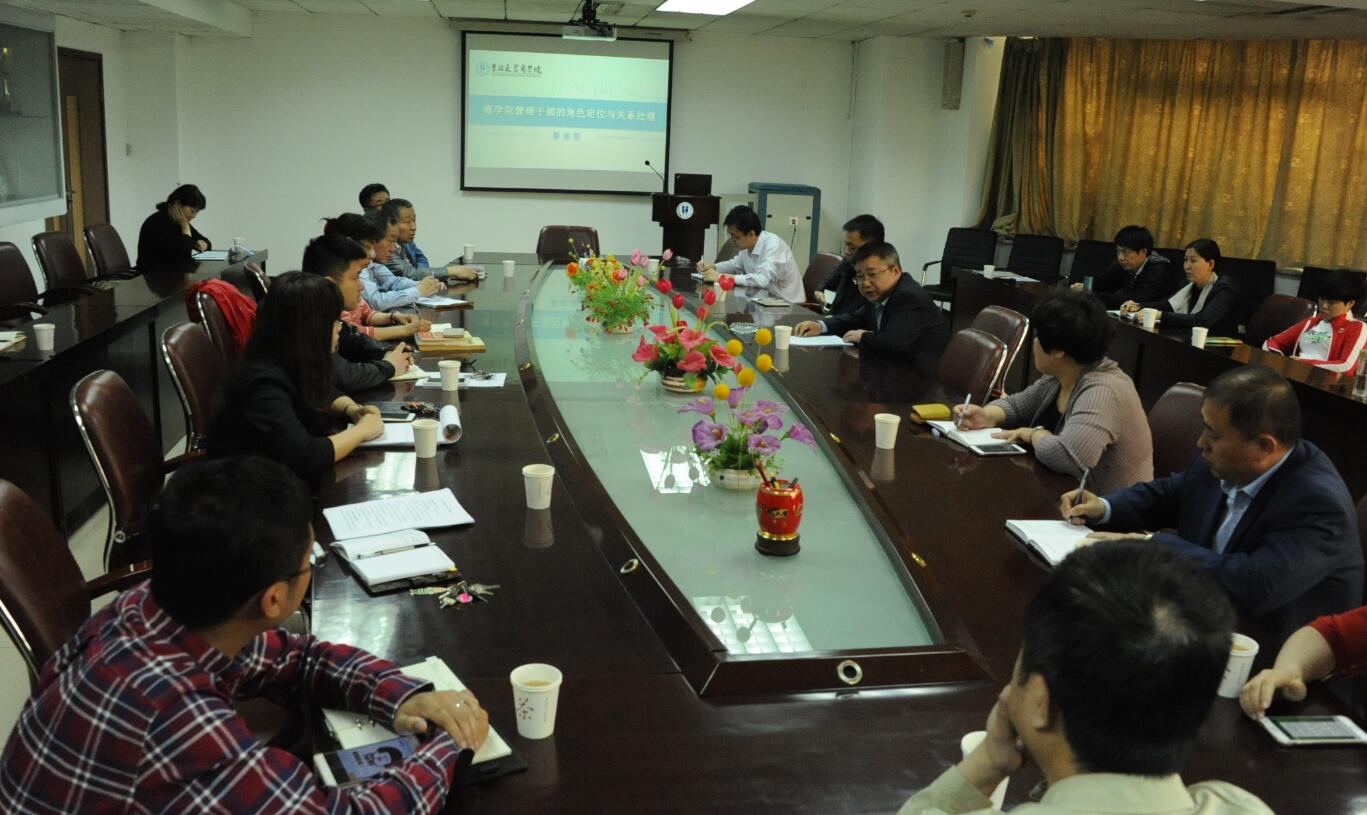 2016年5月25日上午,77779193永利官网管理干部培训在东荣大厦306会议室顺利举行。学院党委书记蔡志刚为全体行政管理干部进行了题为“管理干部的角色定位与关系处理”讲座。