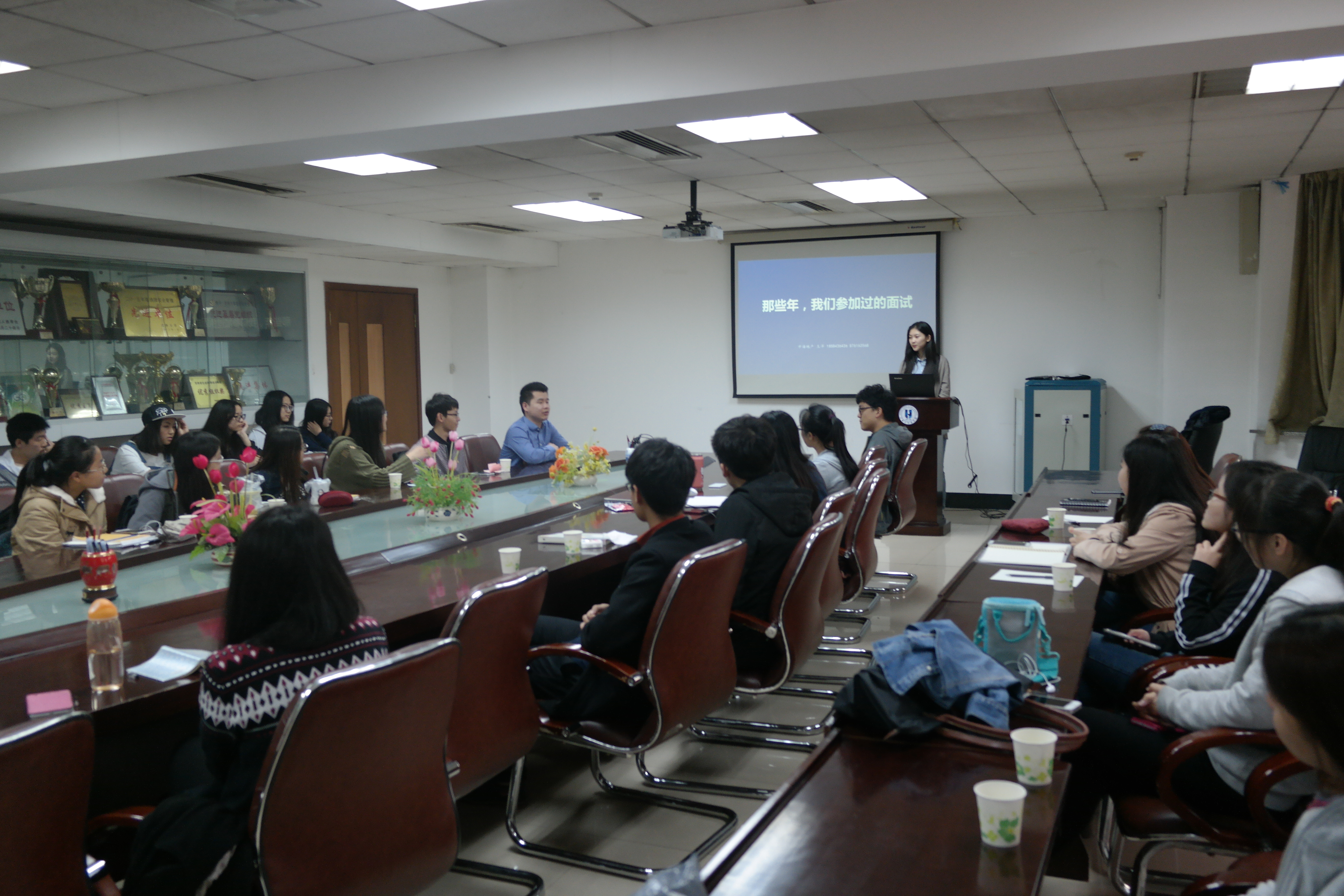 在主持人简洁利落的开场词后,活动进入正式环节。主讲人王洋同学列举了同学们对于就业和面试的一些问题,并就这些问题给出了自己的看法,同时他以一个从事两年HR工作的人员角度,给同学们提出了一些好的建议。他建议同学们在找工作之前首先要自我充实。现在的状态取决于三年前的所做所为。所以,要充分利用大学前三年时间武装自己,在第四年时,尽量找自己未来想从事的相关实习,积累经验。