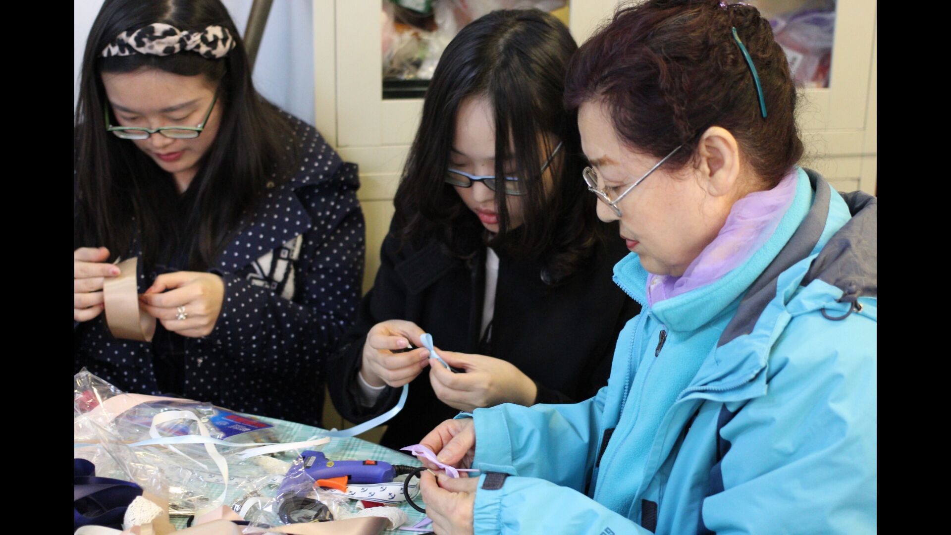 随后,参与活动的同学们与社区成员开始一对一的教授制作如何发饰。在经过一番学习之后,参加活动的社区人员都能熟练的掌握发饰的制作,并对自己做出的发饰十分喜爱。