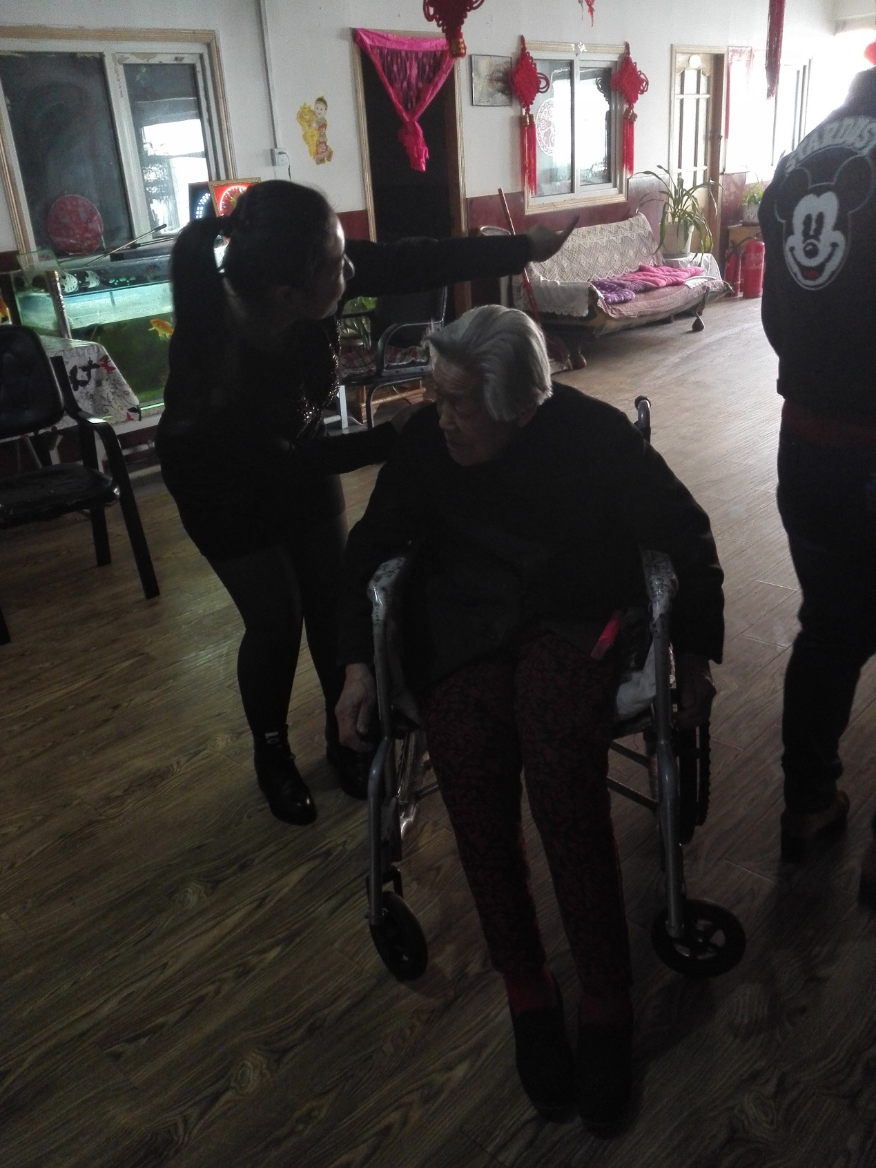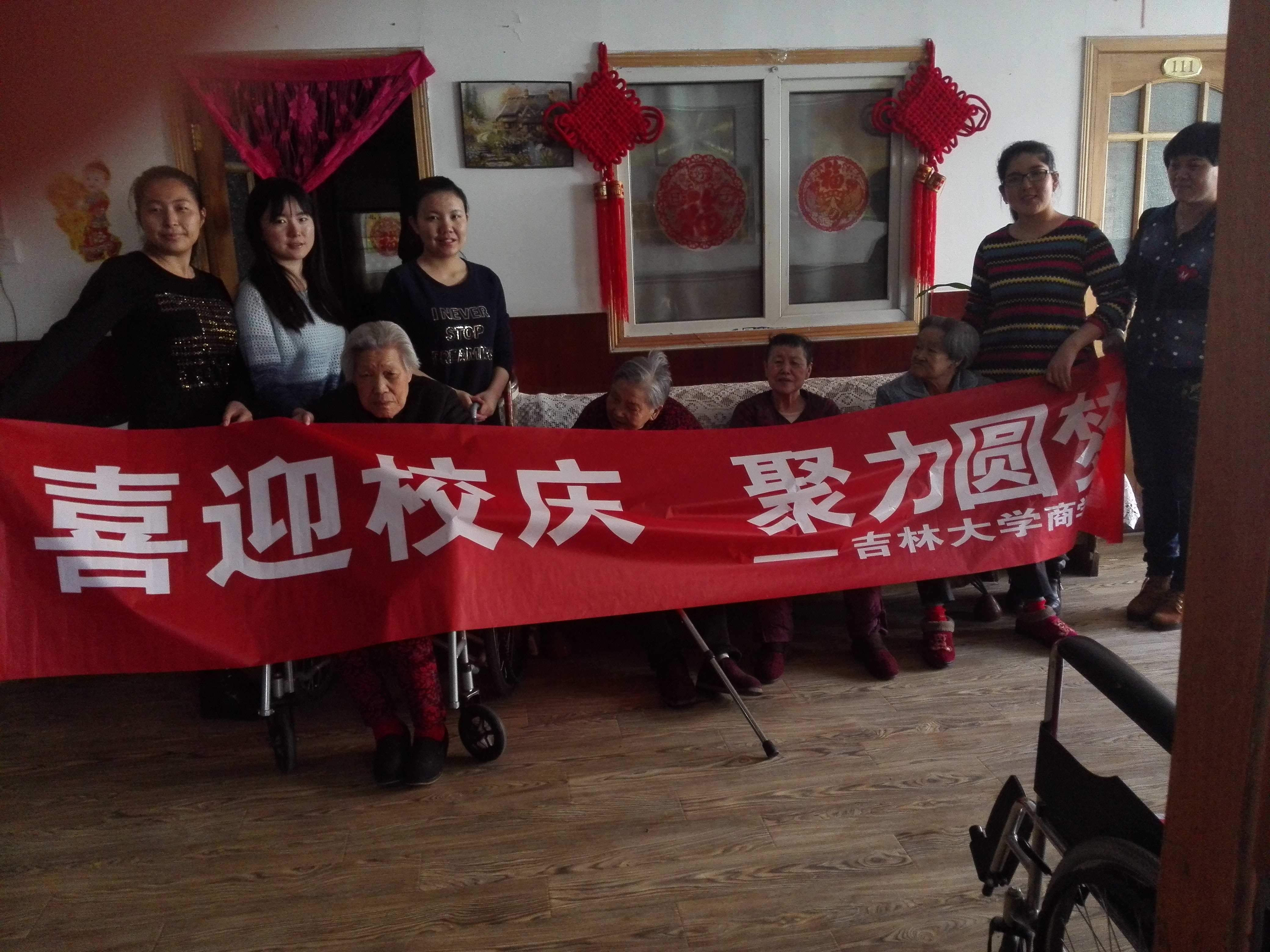 到达养老院后,院长对同学们很亲切,看护阿姨也无比感激地握住同学们的手,院长说这里的老人都是有子女的,孩子工作忙,没时间照顾他们,就送到了养老院,每天就和别的老人看看电视,聊聊天。接着同学们帮阿姨把厨房的墙擦了,又帮助她把大厅清理了一下,陪老人们聊聊天。后来说要照相,一位老奶奶摸着自己的头发说还没收拾下呢,不漂亮了,引得大家笑开了花。还有一位奶奶高兴的唱起了歌,看到老人们如此开心,也不枉同学们在车上颠簸的旅途。