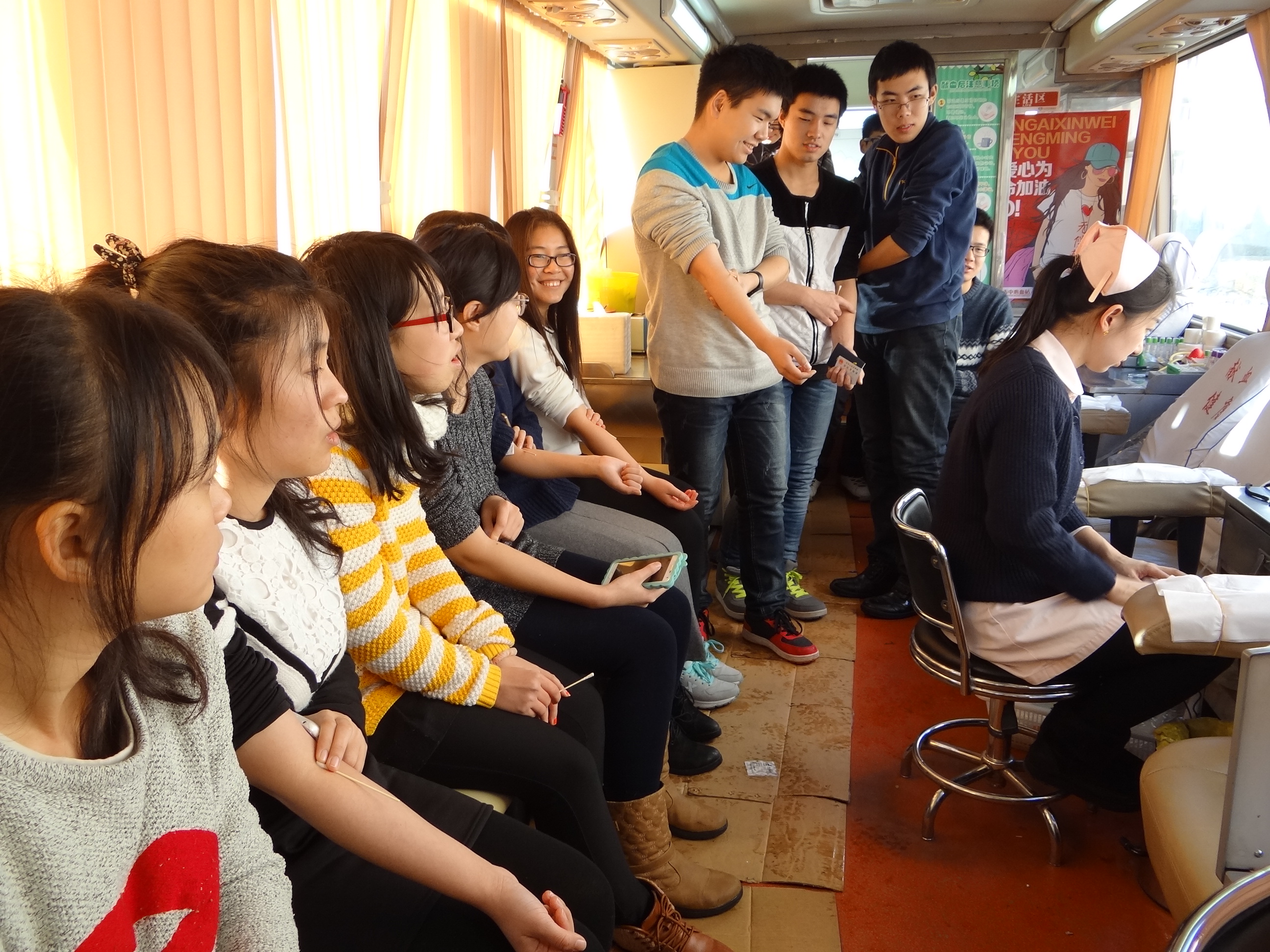 活动中,同学们被分成十人一组,依次进行信息登记和血样检测,由医护人员化验血液成分,经检测合格的同学才可进行献血。抽血过程中,同学们和医护人员亲切交流,散发出满满的爱意,小小的车厢内充斥着欢声笑语。献血的同学们之中不乏害怕抽血的人,但他们克服了恐惧,依然坚持着献完血才离开;也有检测血样不达标的同学,虽然他们没有成功献血,但他们的爱心与勇气依然值得敬佩。