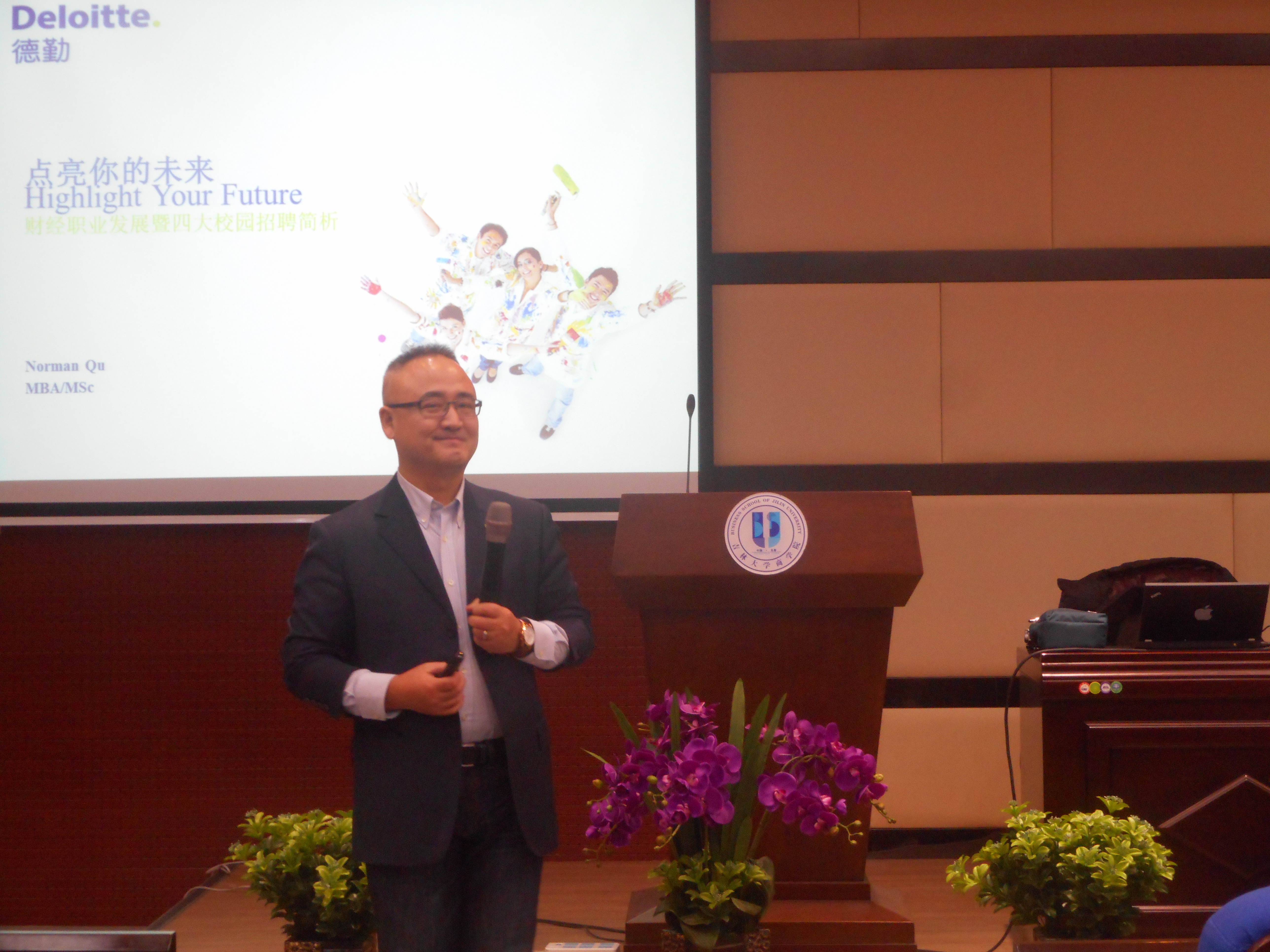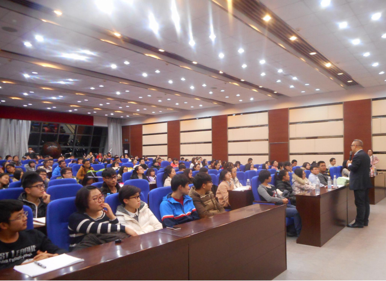 讲座开始后,曲老师首先以一个轻松、有趣的测试题目引入话题,在互动中引发同学们的思考。以德勤为例,曲老师为大家讲解了世界四大会计师事务所校园招聘的流程及人才选拔标准,用数据为同学们指明了当代大学生的就业形势及求职者应该具备的能力。在大学生的人生态度方面,曲老师也自有他的一番独到的见解,他希望大家能做到 “精于情,勤于心”,自尊自信,勤勉诚信,并且要善于打破自己的常规思维,从而走出更加繁华的风景来。在曲悲岩老师的经验分享之后是现场提问环节,同学们积极踊跃地讲出了自己对于面试、职场的疑惑,曲老师都一一做出了耐心细致的解答。
