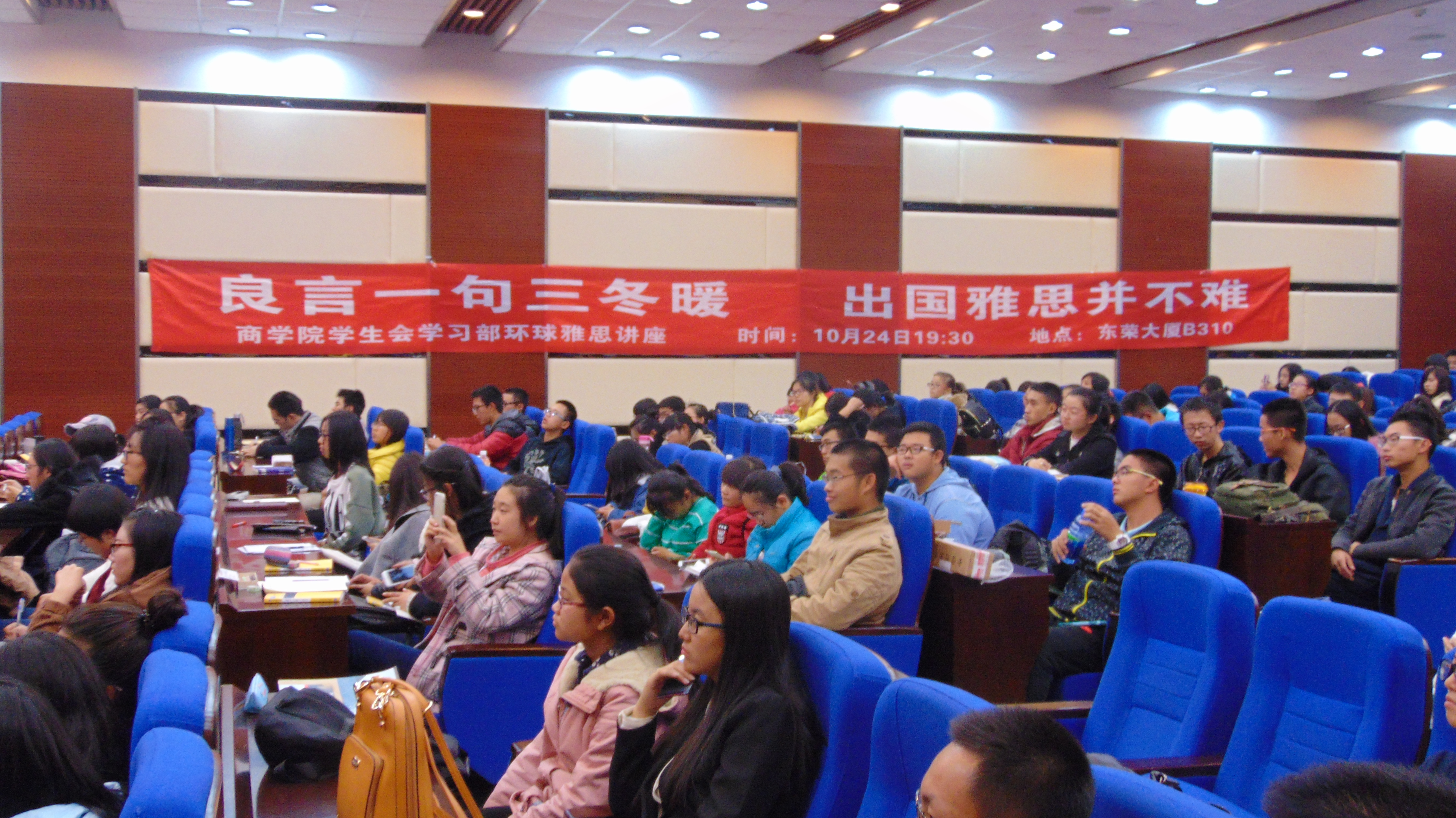 10月24日晚上7点半,77779193永利官网环球雅思讲座在东荣大厦B座310室举办。本次讲座由留学规划专家陶春茂老师和杨翠翠老师对作为英美国家留学的敲门砖的雅思托福考试的一些事项进行讲解。