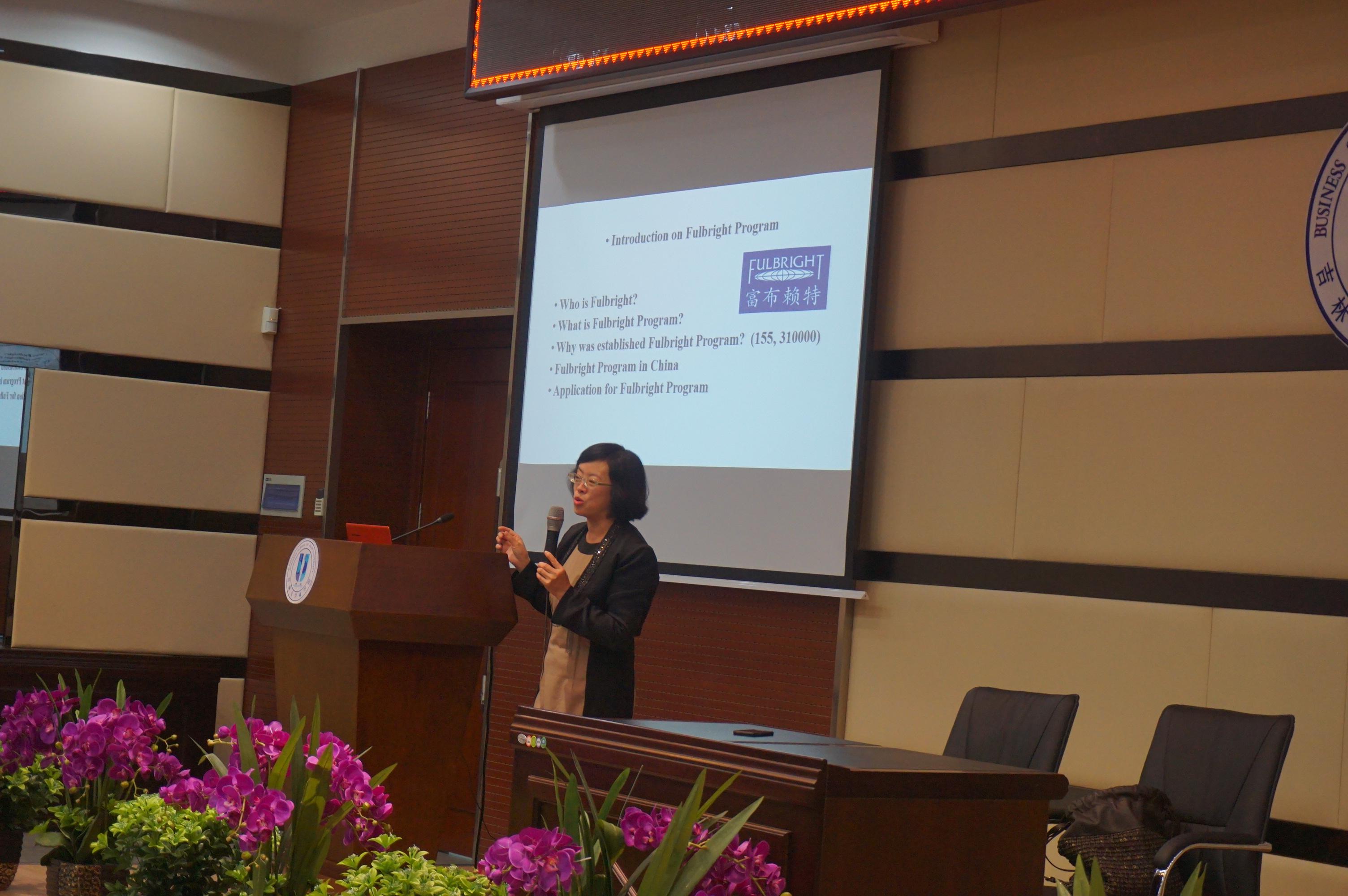 短暂的见面会就这样结束了。紧接着,于桂兰老师走上讲台开始如数家珍地分享她作为富布赖特学者的这一年以及在申请过程中发生的一个个小故事。