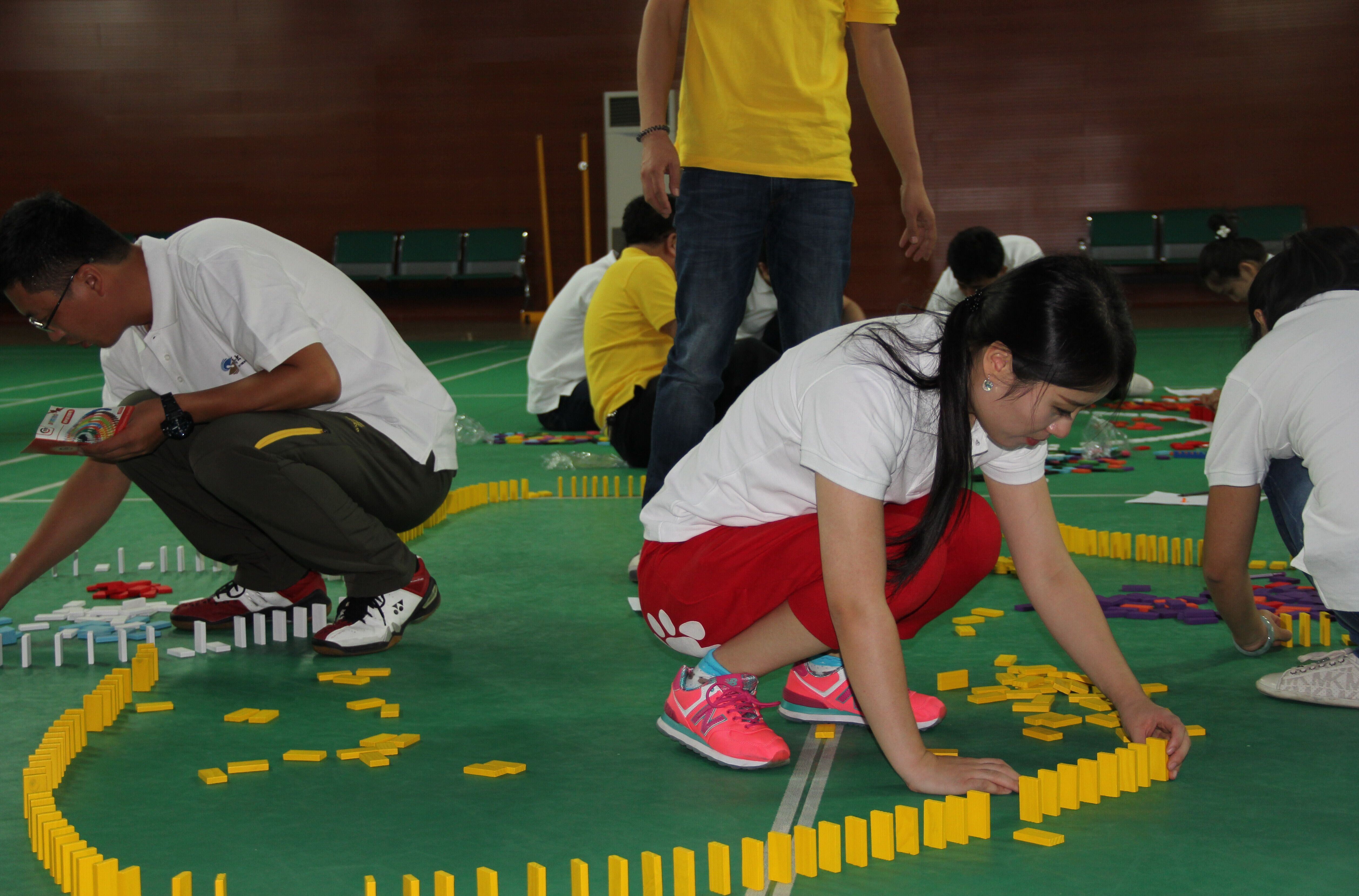 第一个比赛项目,每个队要在半个小时内设计出与自己队名或者LOGO相关的多米诺骨牌,并保证推倒时四个队的牌能够连在一起。各队立即进入了紧张的讨论、策划、分工,每个队员的手中拿着小小的骨牌,认真细致的完成自己所分担的任务。临近规定的比赛时间,活力队的骨牌因队员失误突然全部倒下,活力队队员并没有放弃,他们立即进行恢复,这种坚持影响着其他队的队员,各队队员纷纷过来帮助恢复,充分展示了EMBA应具有的团队精神。