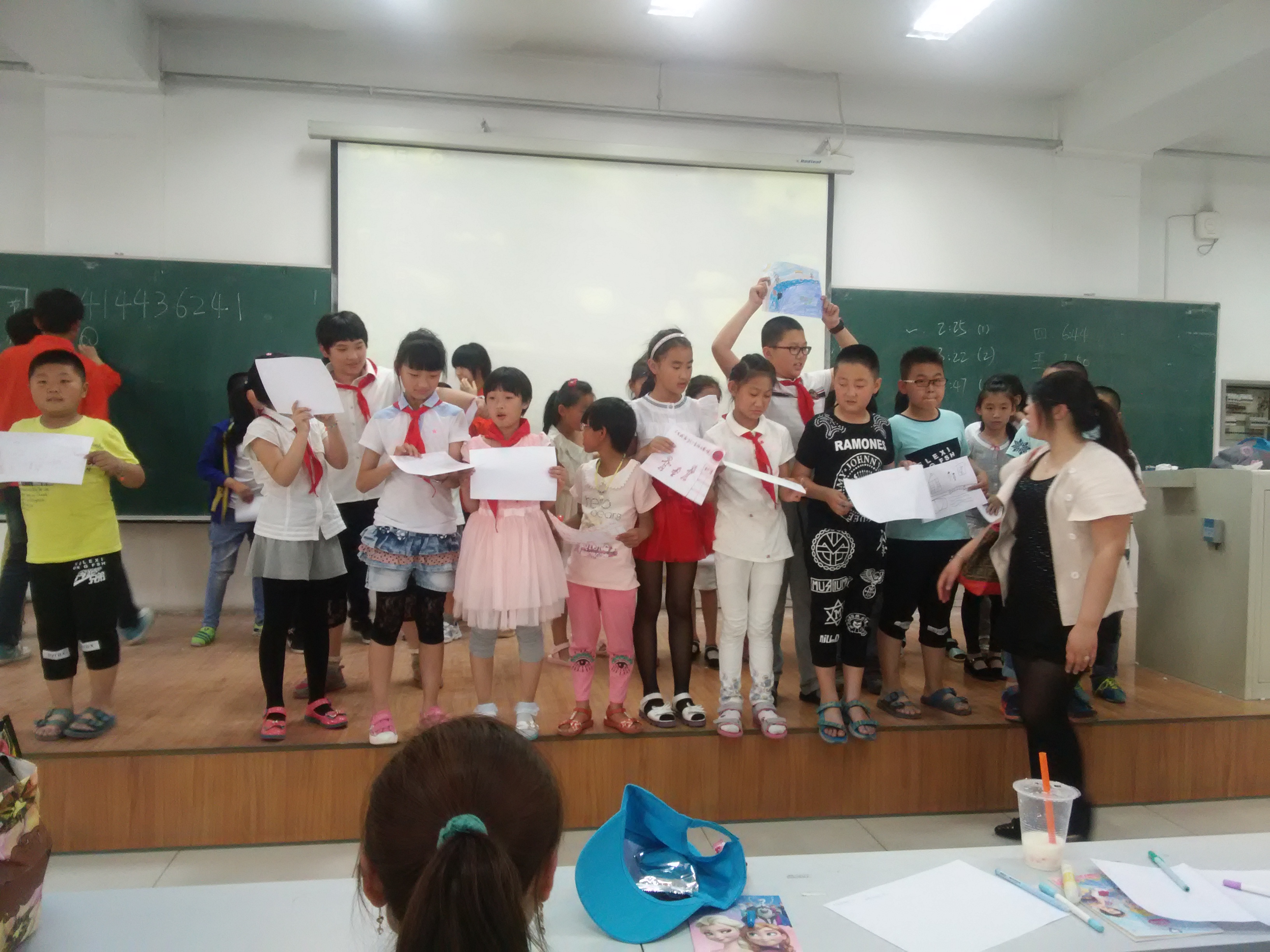 下午在三教十阶,志愿者们和小朋友们进行了节目表演,志愿者们分别演唱了“青春修炼手册”,“渴望春天”和“挥着翅膀的女孩”。接着由志愿者们唱小苹果,小朋友来表演舞蹈。小朋友们表演的舞蹈活泼生动,得到了在场观众们的阵阵掌声。在游戏环节,小朋友们都争先恐后的参加,表现了极大的热情,并从中学习到了许多知识。最后志愿者吉鹏达用毛笔在宣纸上写下了对小朋友的期望,小朋友也用画笔画出了自己心中吉大最美的瞬间,虽然画笔描绘的十分稚嫩,但仍旧表达了小朋友们对吉大的热爱之情。